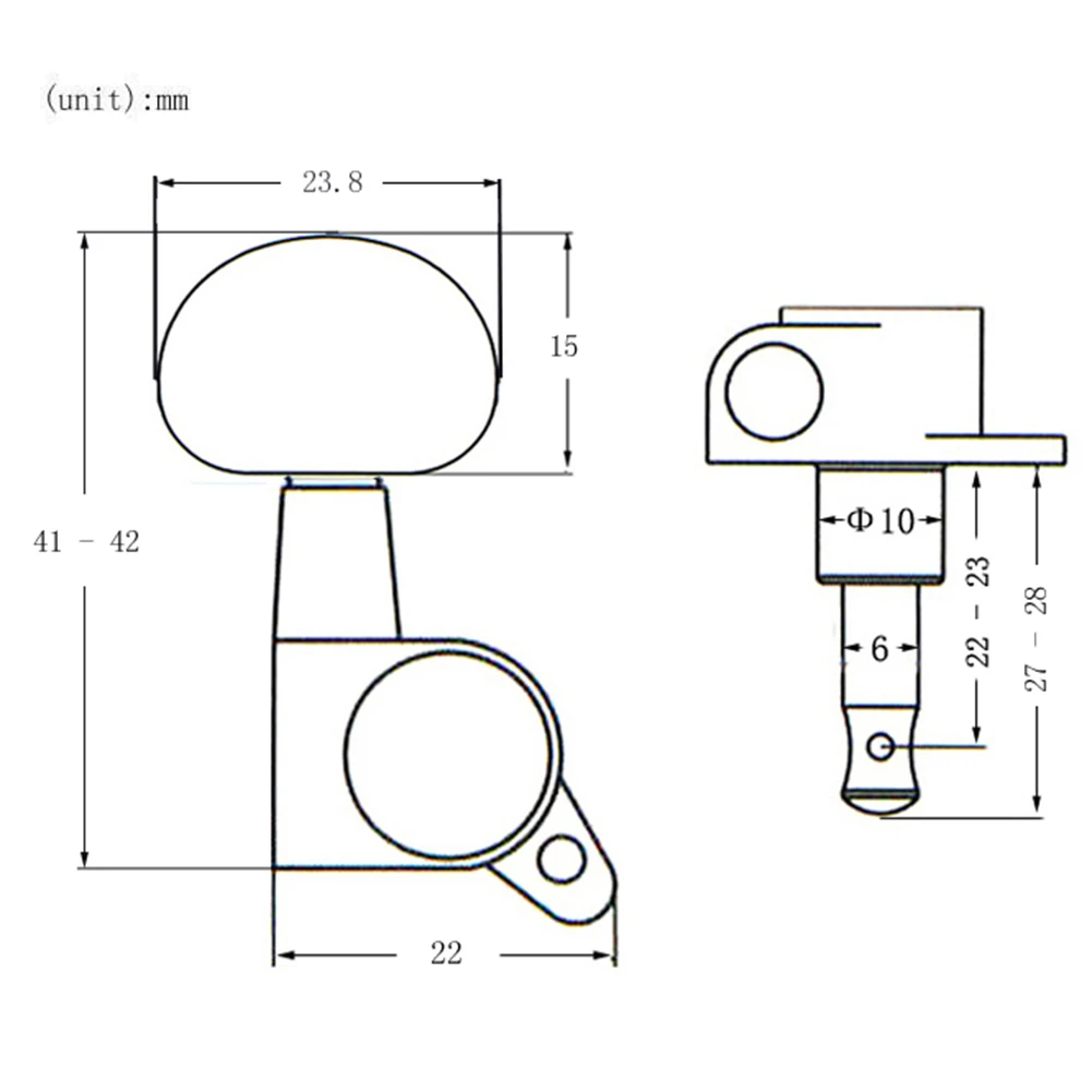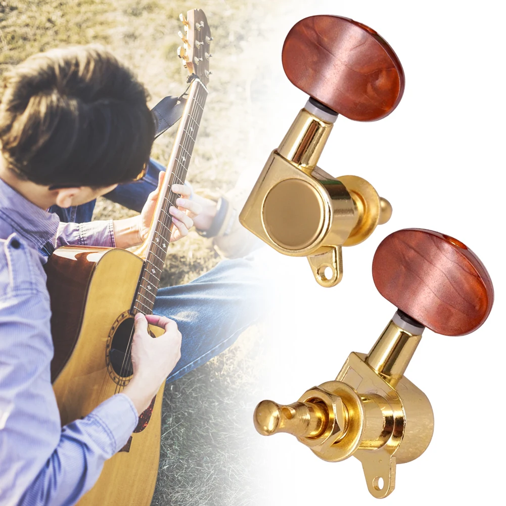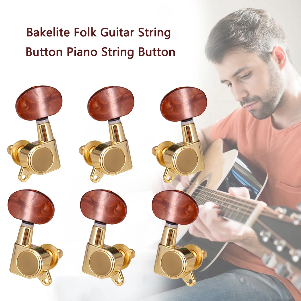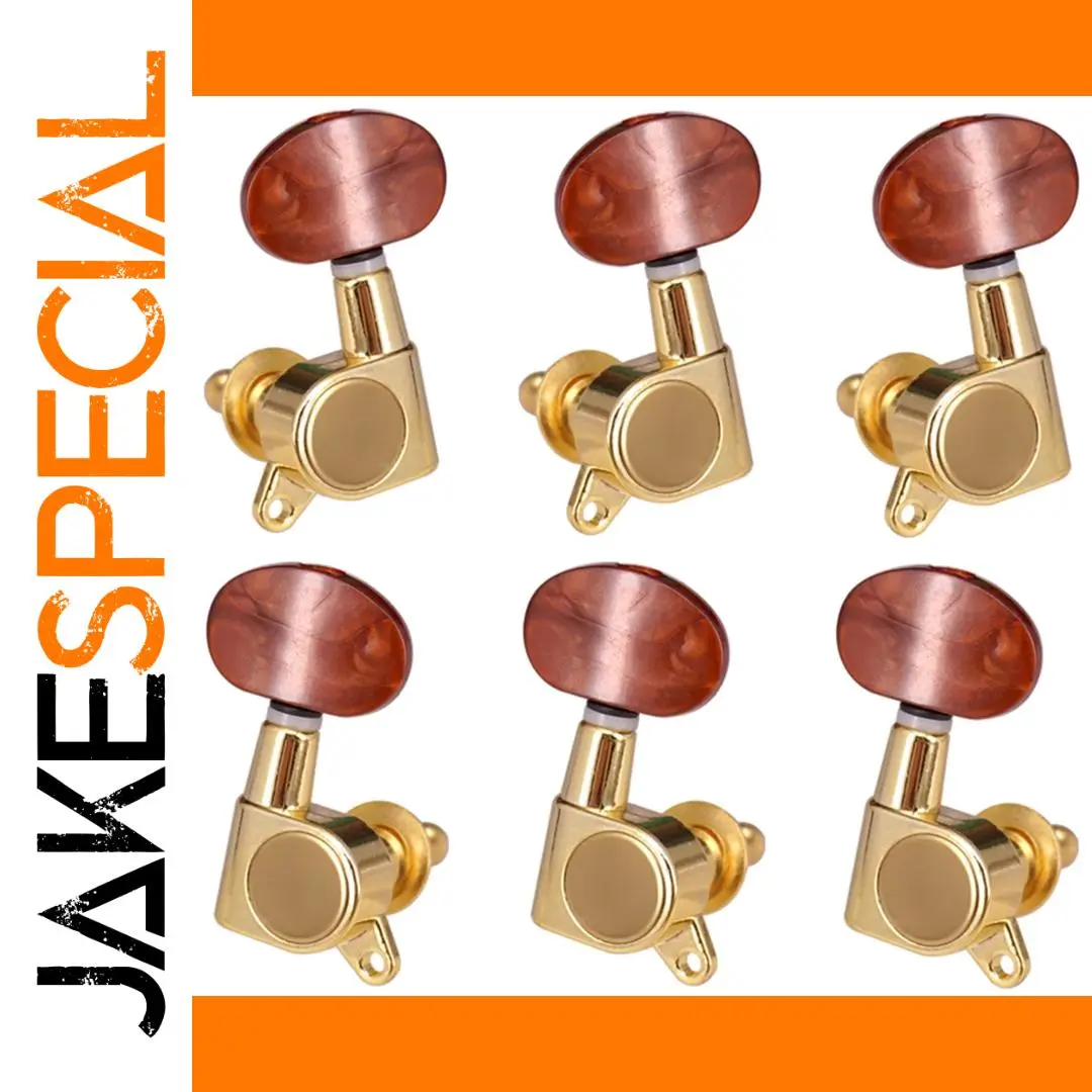 Elevate your guitar’s performance with this set of 6 enclosed locking guitar tuning pegs. Designed for both acoustic and electric guitars, these machine heads feature a polished gold finish for a sleek appearance, complemented by closed knobs in a warm brown, wood-like color. Each peg showcases a compact and sturdy design with a square base and a circular knob for easy grip during tuning. Battery-operated for convenience, they offer simple installation and demonstrate exceptional craftsmanship, ensuring durability and reliability. Upgrade your tuning experience with these elegant, versatile accessories that beautifully enhance your instrument’s aesthetics and functionality.