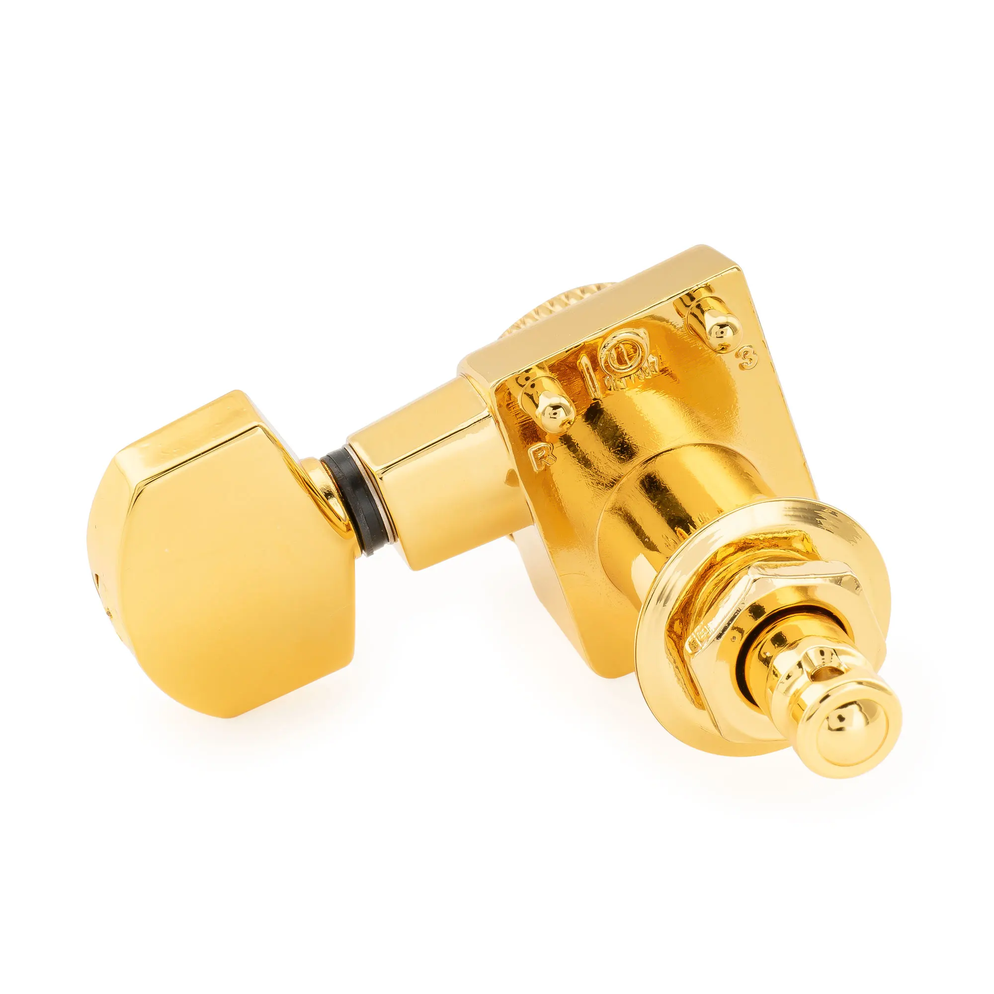Enhance your Fender-style electric guitar with this premium locking machine head tuner featuring an 18:1 gear ratio for precise tuning. Crafted from zinc alloy with a durable electroplated finish, it offers smooth operation and improved string stability. Designed for 10mm (25/64 inch) peg holes, it features a convenient 2-pin mounting system that requires no screws, making installation effortless. Compatible with both left-handed (treble side) and right-handed (bass side) configurations, available in black, chrome, gold, and nickel options. Sold individually or in sets of six, this high-quality tuner combines sleek aesthetics with functional excellence to maintain your guitar’s tuning stability.
