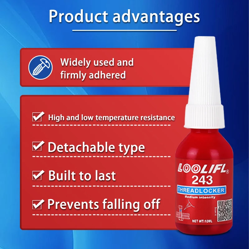Upgrade your toolkit today with this reliable LOOLIFL 243 thread lock adhesive. Whether you're tackling complex automotive repairs or simple household fixes, this product offers confidence in every application. Its durable, anti-slip properties mean you can work more efficiently, knowing your fasteners will stay tight and secure. The compact design makes it easy to store and use precisely where needed. Don't wait—protect your investments and ensure safety with this versatile, high-performance adhesive built for demanding environments. Make your repairs last longer and work smarter with this essential product.