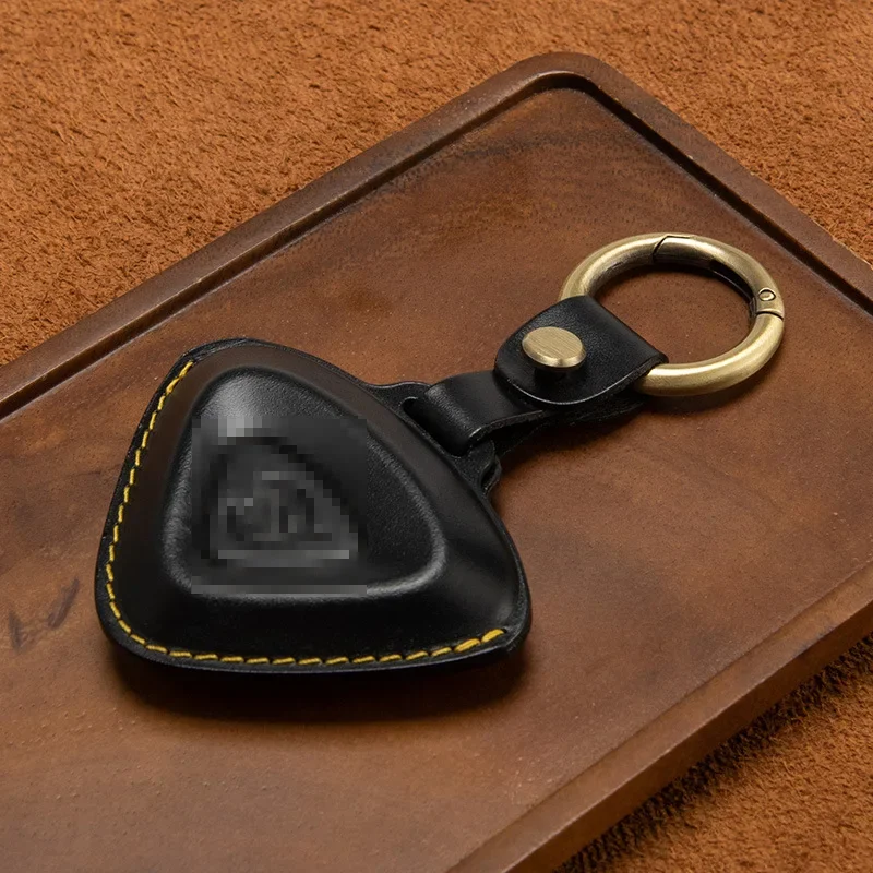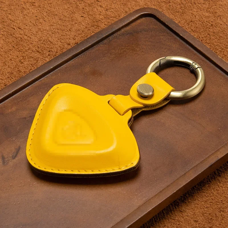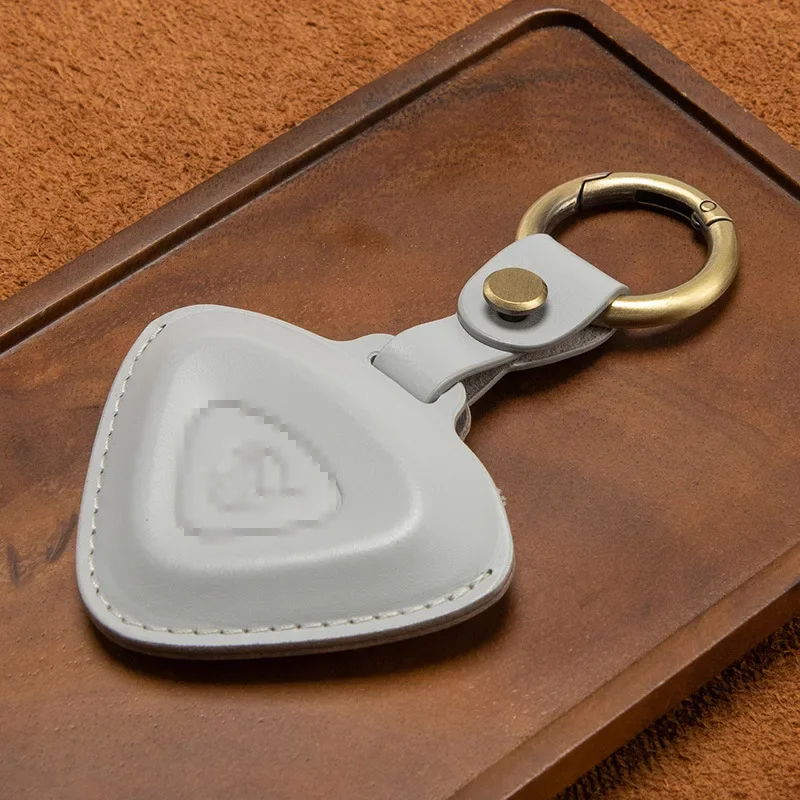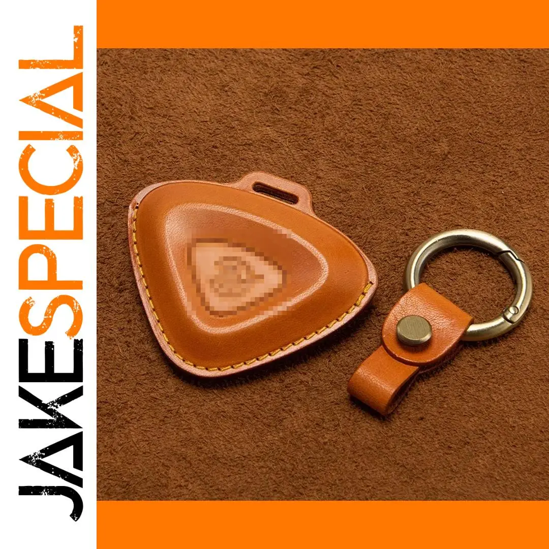 This unique leather key case is designed specifically for Lotus Cars models including the Emira, Evija, Eletre, and Emeya. Crafted from top layer leather, it features a distinct triangular shape in warm tan or light brown, combined with a polished surface that reflects sophistication. The contrasting light yellow decorative stitching adds a handcrafted touch, while the embossed Lotus emblem in the center showcases your automotive passion. A convenient leather strap with a metal snap button leads to a shiny silver-tone circular keyring, enhancing the key case's functionality. Picture yourself owning this elegant piece, perfectly designed to protect and stylishly store your car keys.