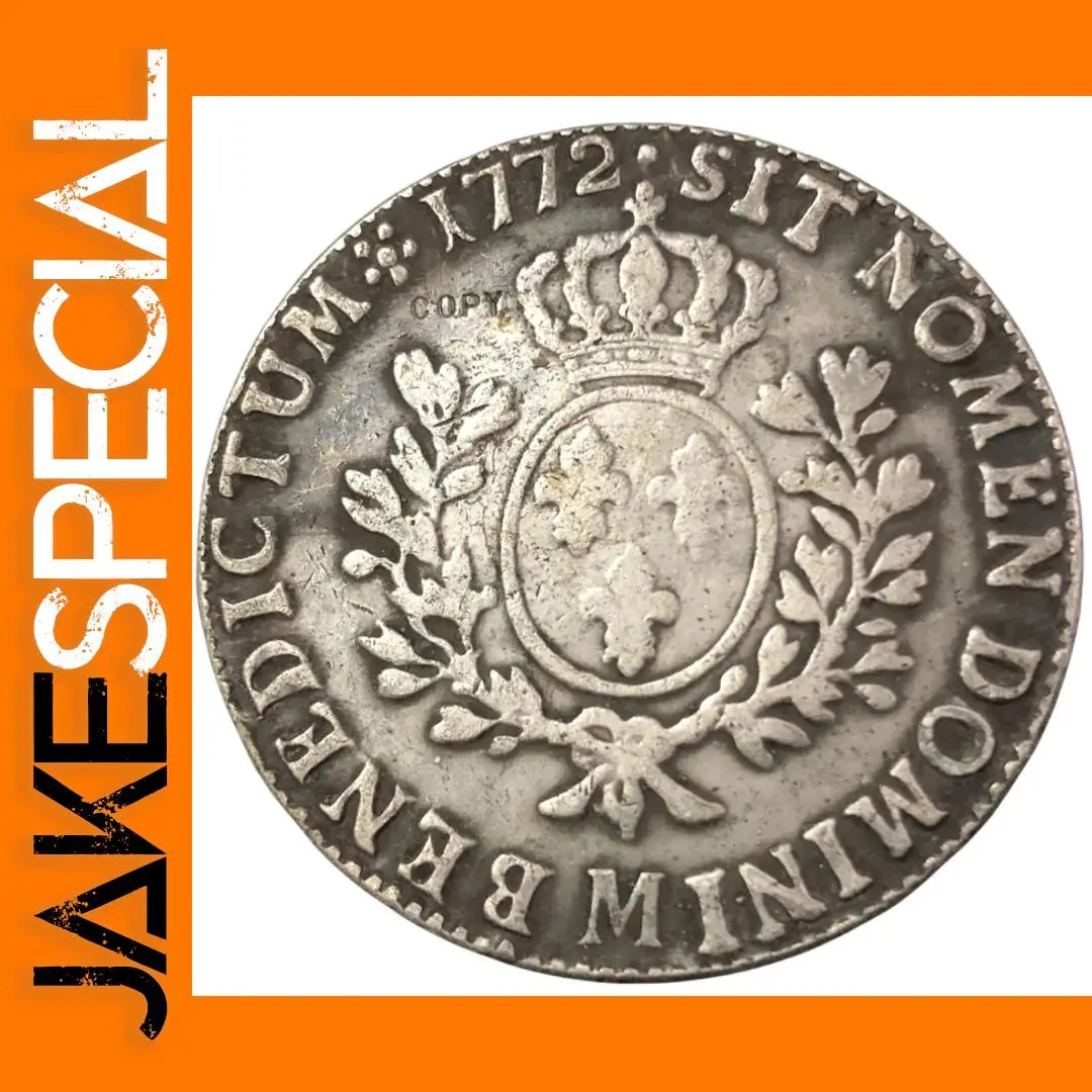 Experience the timeless elegance of this Louis XV imitation, meticulously crafted to evoke the grandeur of 18th-century European craftsmanship. Its round shape, aged finish, and textured surface exude antique charm, while detailed engravings highlight the intricate design elements. The central shield, decorated with floral motifs within a circular frame, commands attention and admiration. Surrounding the shield are ornate laurel or oak branch motifs, adding a rich, textured appearance. Prominent inscriptions such as “1772” and “S.M.” mintmark further reinforce its historical authenticity. The Latin inscription “ST NO[M]IN[RE] D[OMIN]A” along the outer edge adds a regal touch, all fashioned in traditional serif fonts. This piece offers a blend of vintage aesthetics and historical significance, perfect for collectors or decorative displays.