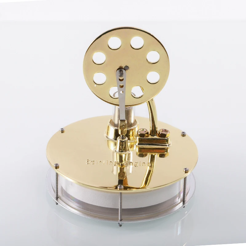 Experience the elegance of this high-quality low-temperature Stirling engine model, expertly crafted from polished metal with a shiny, gold-toned finish. Its modern design combines precision engineering with a refined aesthetic, making it not only an educational demonstration but also a striking decorative piece. The circular, mirror-like base supports a transparent glass cylinder—revealing the internal components and illustrating thermodynamic principles clearly. At the top, a beautifully crafted open-spoked gold flywheel dynamically showcases energy transfer, connected to a polished metal piston with intricate linkages. This model embodies technical sophistication, seamlessly blending beauty and function. Perfect for enthusiasts, students, and collectors keen to explore thermoacoustic external combustion technology in a visually captivating way.