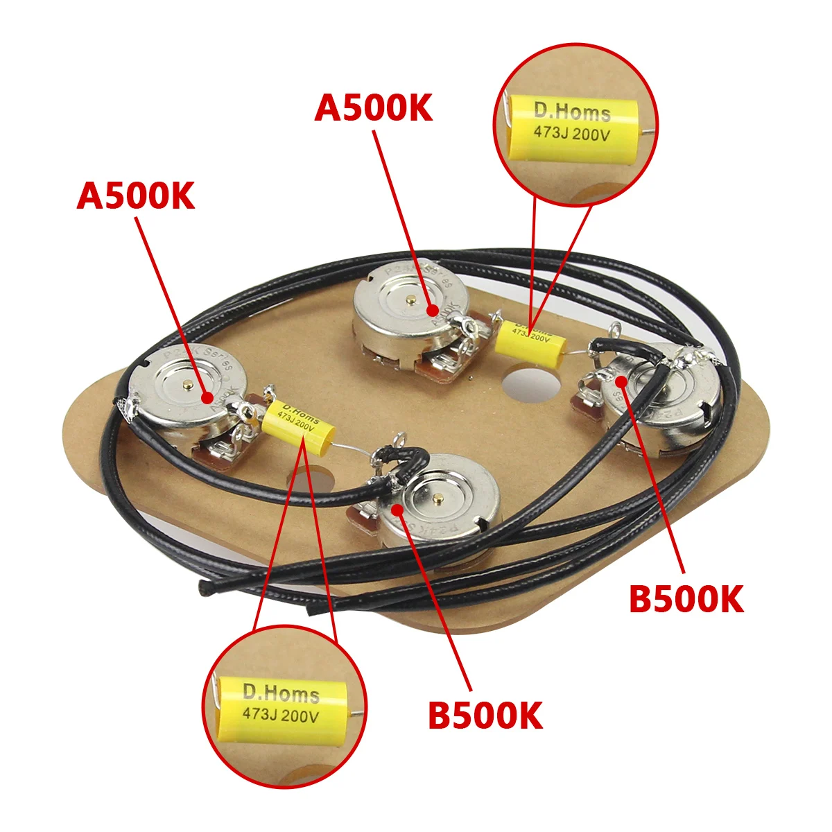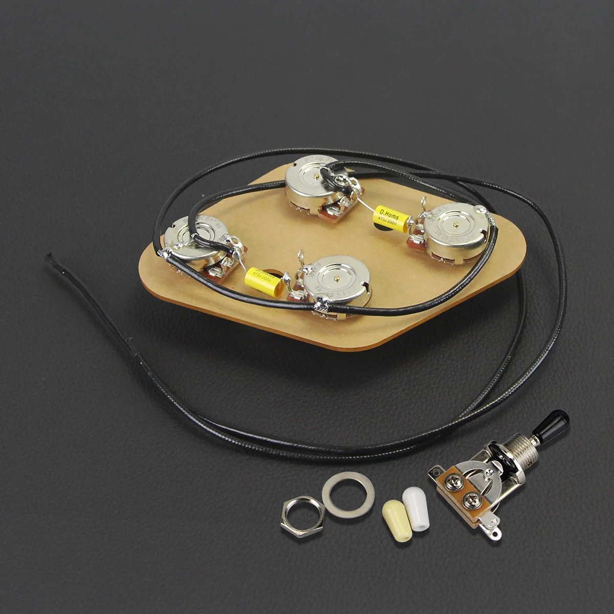 Upgrade your LP-style electric guitar with this premium prewired wiring harness kit, featuring two 500K potentiometers with 24-spline long split shafts, approximately 6mm in shaft diameter, 19mm in shaft length, and 9.5mm threaded shaft diameter. The kit includes a 0.047uF (473J) capacitor rated at 200V and a separate non-soldered 3-way toggle switch with black, white, and cream tips. Mounted on a durable protective plate with high-quality soldered assembly and vintage-style insulated wiring, this kit offers a professional, organized, and reliable way to enhance your guitar’s sound and functionality with ease and style.