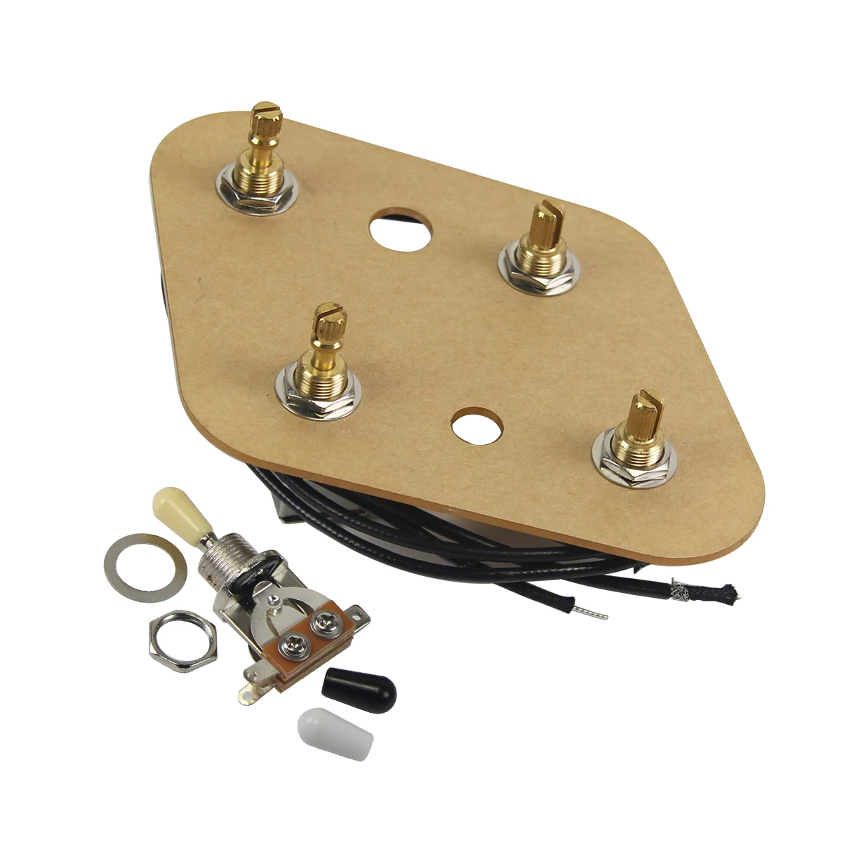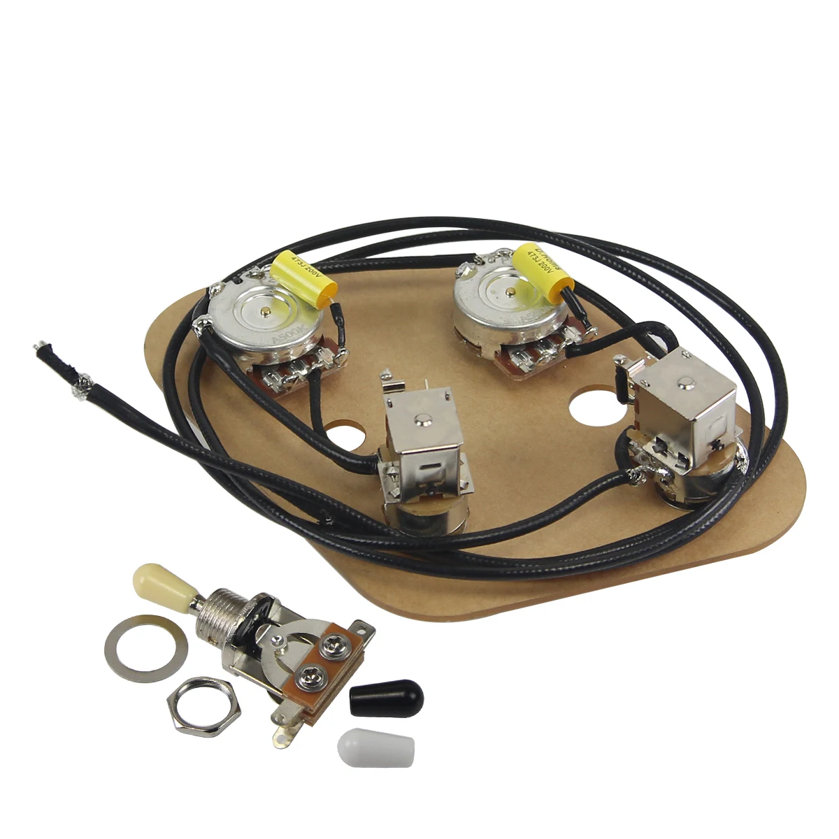 Enhance your electric guitar with this premium prewired wiring harness kit, designed specifically for LP-style guitars with 4-wire humbuckers. Crafted with durability and sound quality in mind, this kit features high-grade 500k potentiometers, including two long, split-shaft A500k tone pots and two B500k push-push volume pots, all built with copper shafts to minimize noise. The separate 3-way toggle switch, available in black, white, and cream tip options, offers versatile switching capabilities, perfect for customizing your sound. Assembled with 473J 200V capacitors and vintage metal push-back wires, it ensures longevity and superior tone. Mounted on a sturdy protective plate, installation is straightforward, making this an ideal upgrade or replacement component for discerning guitarists seeking reliable, high-performance electronics.