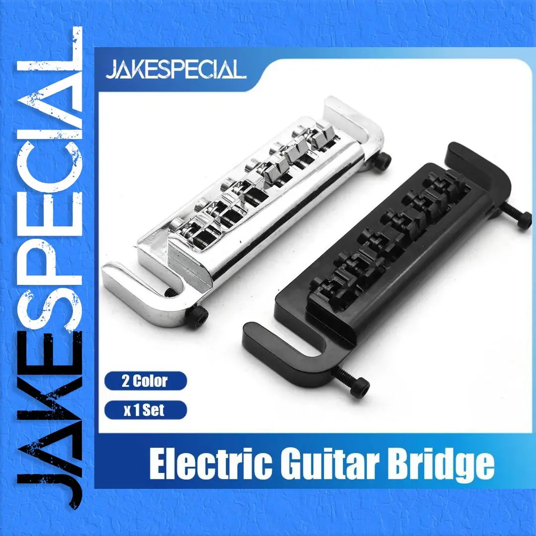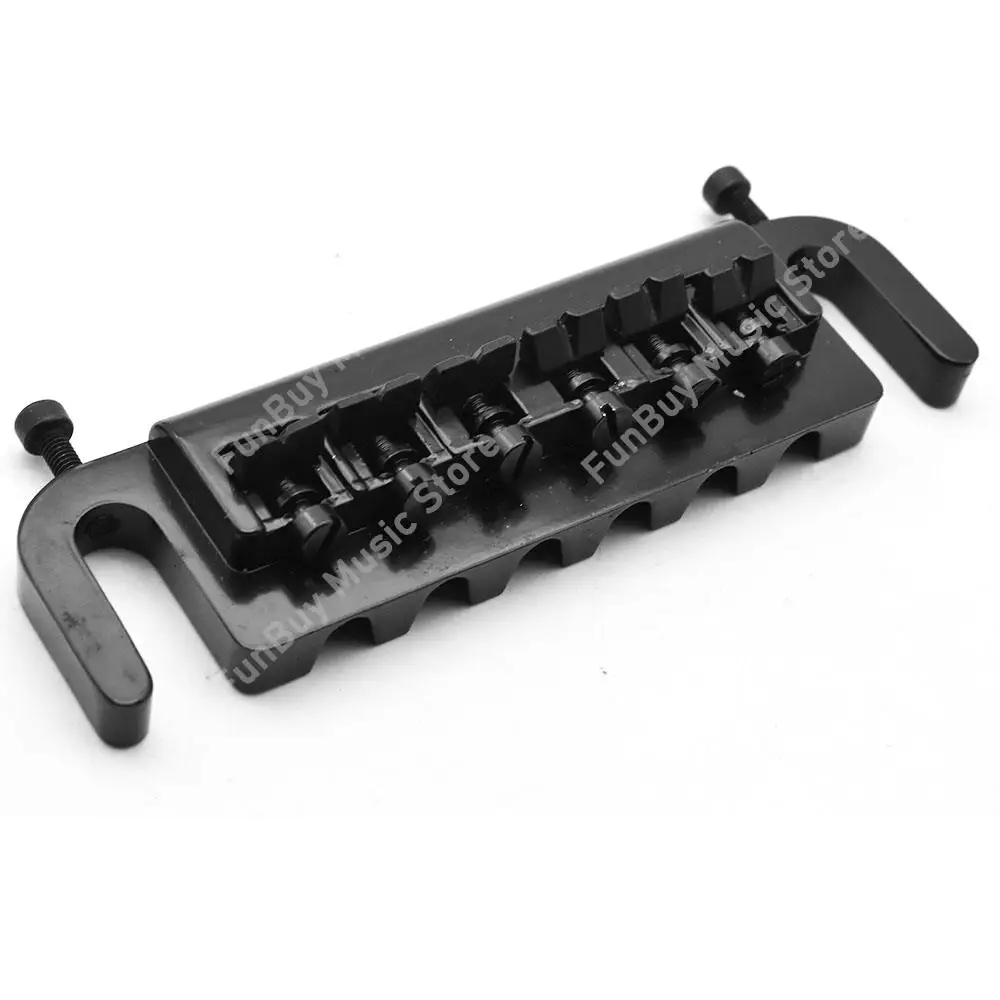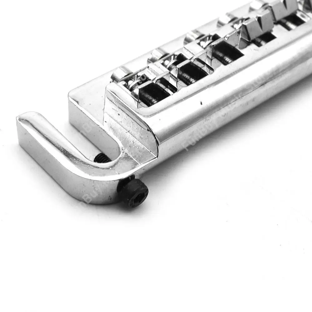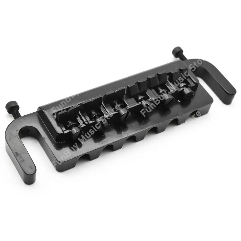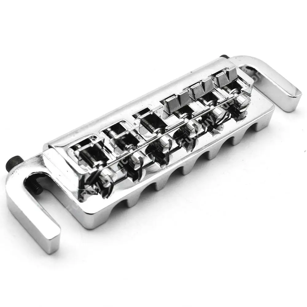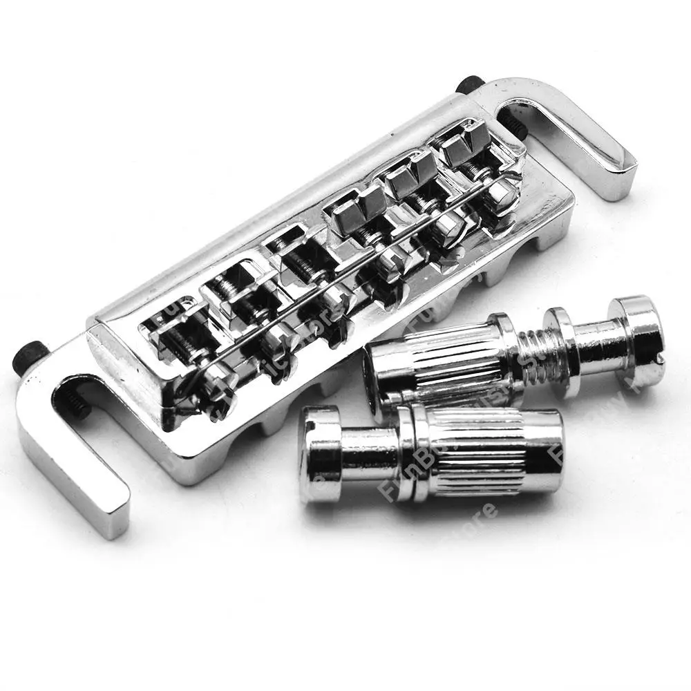 Imagine upgrading your solid-body electric guitar with this high-quality wraparound bridge, designed specifically for Les Paul style models. Its sleek zinc alloy construction offers durability while maintaining a lightweight feel. Available in polished chrome and matte black, it adds a modern yet classic aesthetic to your instrument. The bridge features six brass saddles, each adjustable for precise intonation, loaded from the front for easy string installation. With threaded mounting studs and anchor bushings included, installation is straightforward, ensuring a firm fit. Whether you're aiming for a shiny, reflective finish or a sleek, subdued look, this bridge enhances both the visual appeal and performance of your guitar. Perfect for replacing or upgrading your existing hardware, it guarantees enhanced tone and stability.