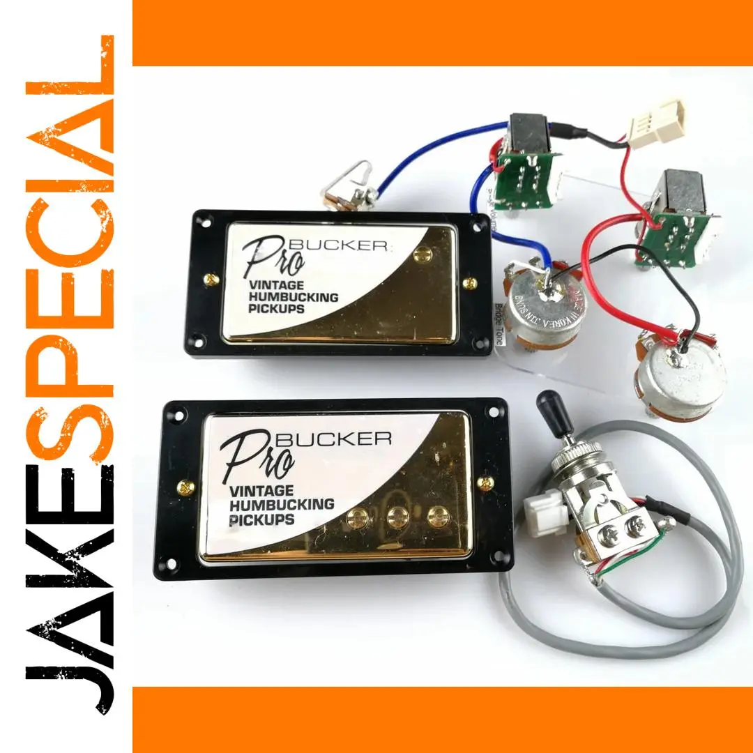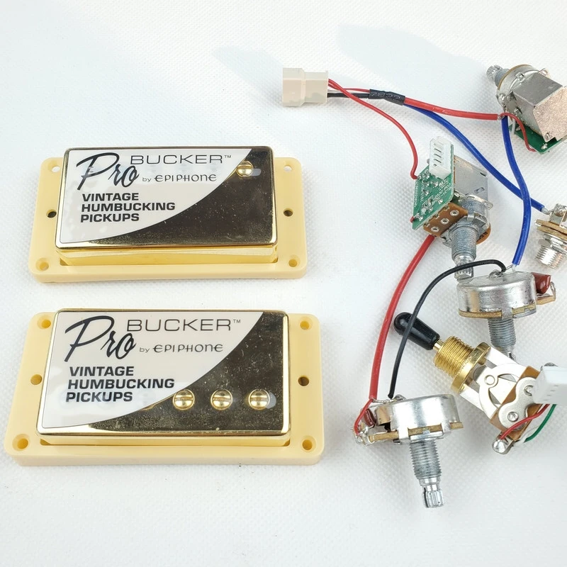 Elevate your guitar experience with this set of LP Standard ProBucker Alnico Humbucker pickups. Featuring a distinct vintage look with elegant gold covers and rounded black casings, these pickups offer exceptional tone and versatility. Imagine seamlessly switching from warm, mellow sounds to bright, crisp notes just by adjusting your configurations. The included wiring harness, complete with control pots and a toggle switch, ensures you have everything you need for effortless installation. Picture yourself strumming away, a newfound clarity in your music, as these pickups bring your electric guitar to life.