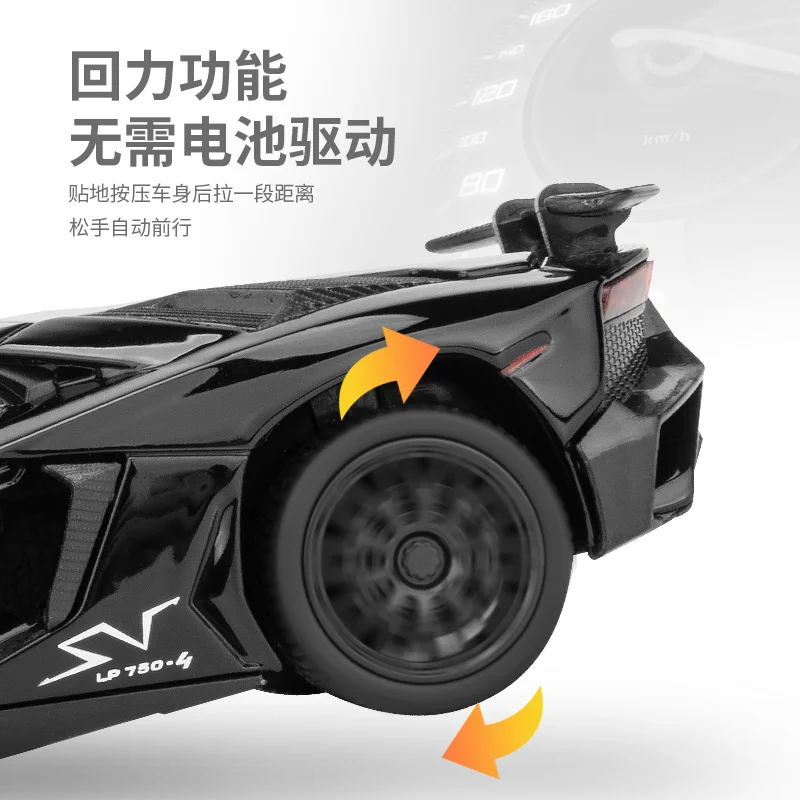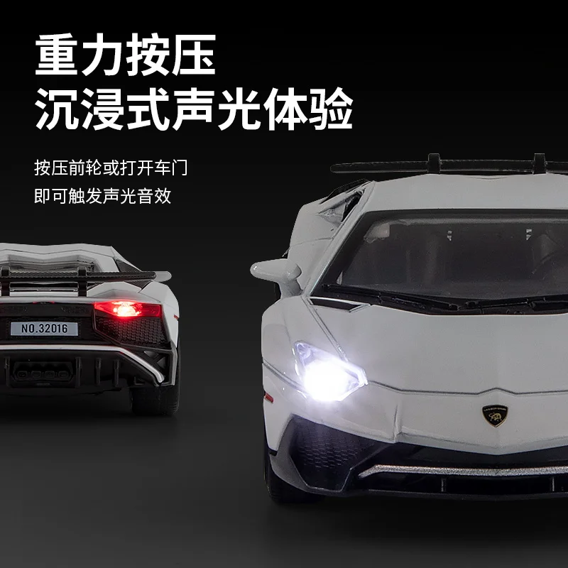 Imagine yourself holding this meticulously crafted diecast alloy model, perfectly sized at 15 cm in length, with its glossy black finish highlighting every sharp angular line. Its aerodynamic design exudes speed and sophistication, with detailed vents, aerodynamic features, and a rear wing spoiler that suggest high performance. The vertically opening doors add an exciting realism, revealing a detailed interior. When you activate the sound and light functions, you’re immersed in a miniature experience of automotive excellence. This collectible toy seamlessly combines modern style and technical precision, making it an eye-catching display piece or a treasured gift for enthusiasts and collectors alike. Feel the thrill of owning a finely detailed miniaturized version of this luxury sports car in your collection.