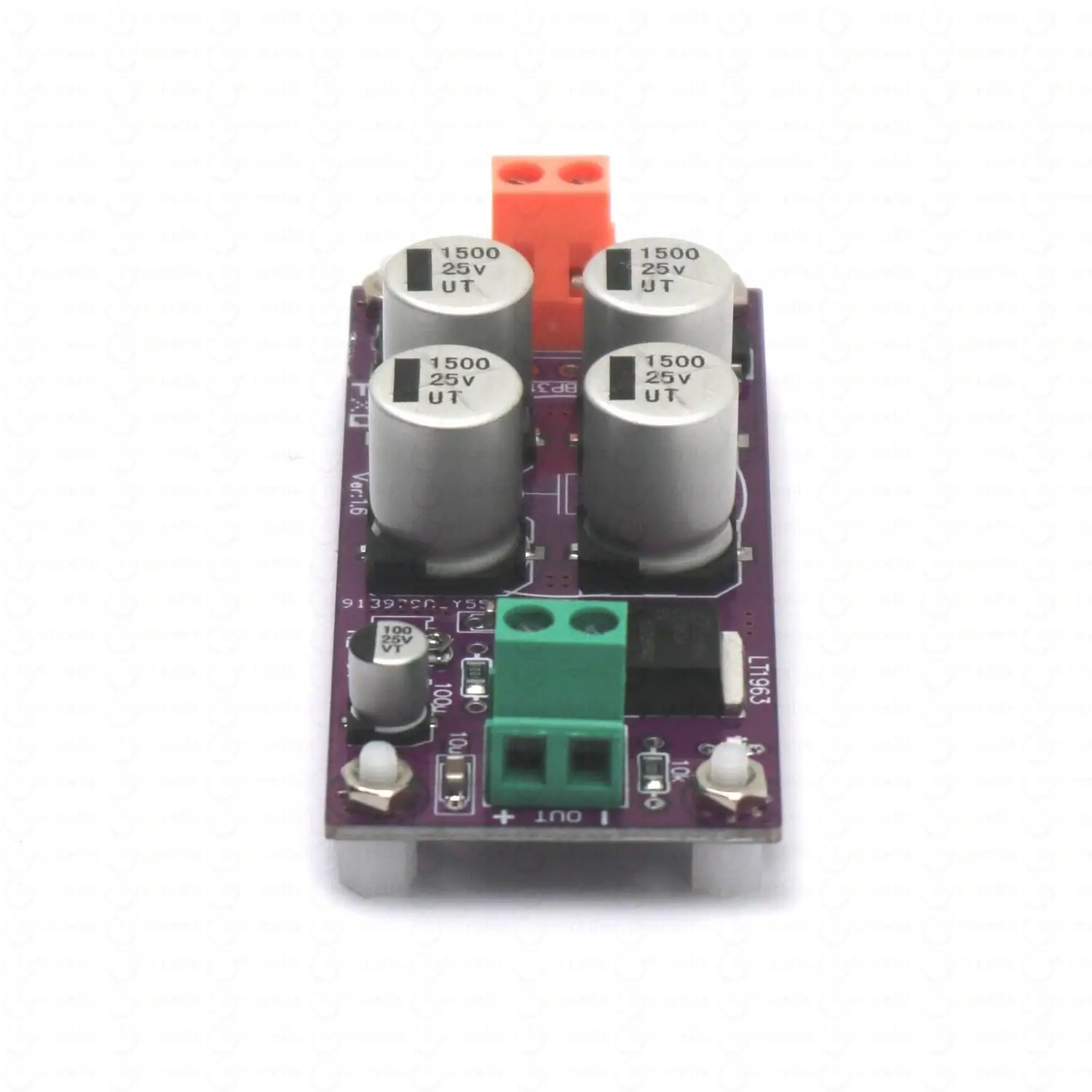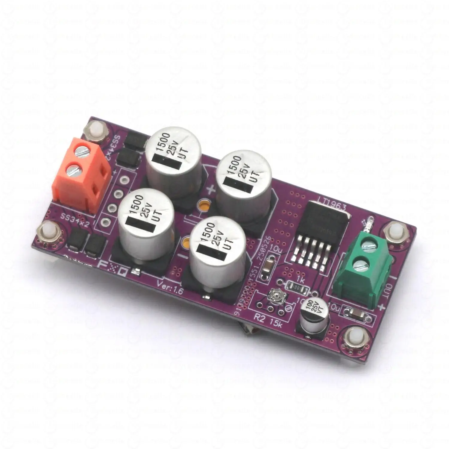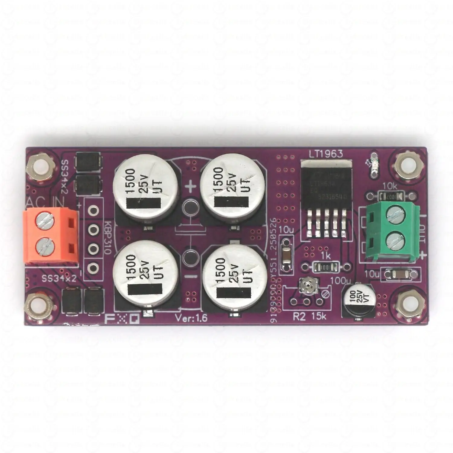 This precision LT1963A low-noise linear regulator features an adjustable output voltage from 1.21V to 18V, supporting input voltages between 1V and 15V AC or up to 20V DC. It delivers up to 1.5A of continuous current with a dropout voltage of approximately 340mV and an output noise of just 40µV RMS over 20Hz–20kHz. Designed for high-end audio applications such as DAC reference supplies and phono preamp power conditioning, it can provide up to 15W with proper heatsinking. Its compact 35×80mm PCB layout allows easy configuration via resistor divider to output 5V, 12V, 15V, or 18V, ensuring reliable, ultra-low noise power regulation for demanding audio and instrumentation setups.
