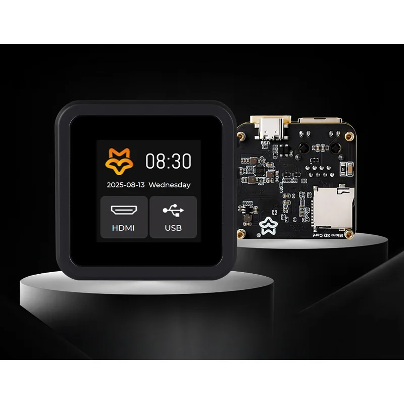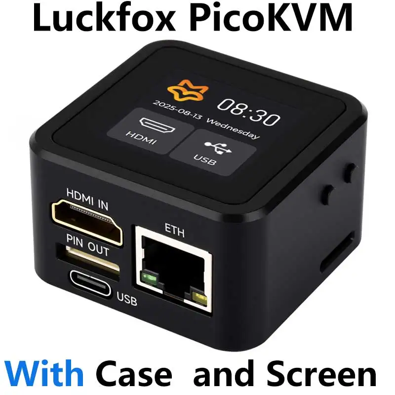 Experience seamless remote management with the this Luckfox PicoKVM, a compact and sleek device designed for professionals who need reliable control over servers, PCs, and development boards. Its modern, minimalist enclosure features a smooth matte black finish with rounded edges, easily fitting onto your desktop or maintenance area. The 1.54-inch high-resolution touchscreen LCD adds a sophisticated touch, displaying vital system information such as IP address, connection status, and operational data. Equipped with a gold-accented HDMI port, USB interfaces, and a 100Mbps Ethernet connection, it ensures stable, low-latency video and control signal transmission. Its lightweight design, combined with practical features like a TF card slot and I/O expansion, makes remote management intuitive and efficient.