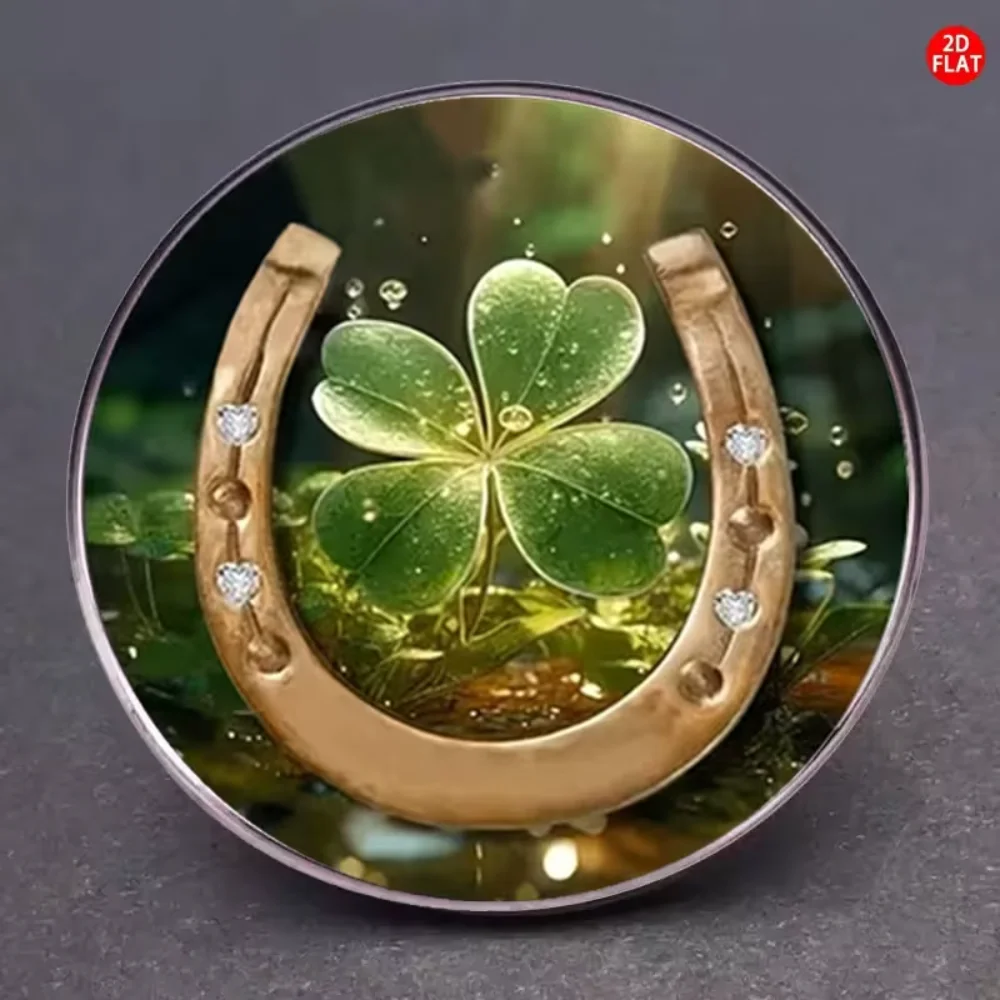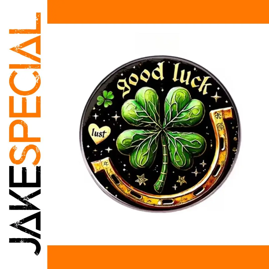 - Features a vibrant, detailed four-leaf clover in bright green with vein patterns, a celestial starry backdrop in black, and accents of “good luck,” “lust,” and a gold-gradient horseshoe to symbolize luck and vintage charm.