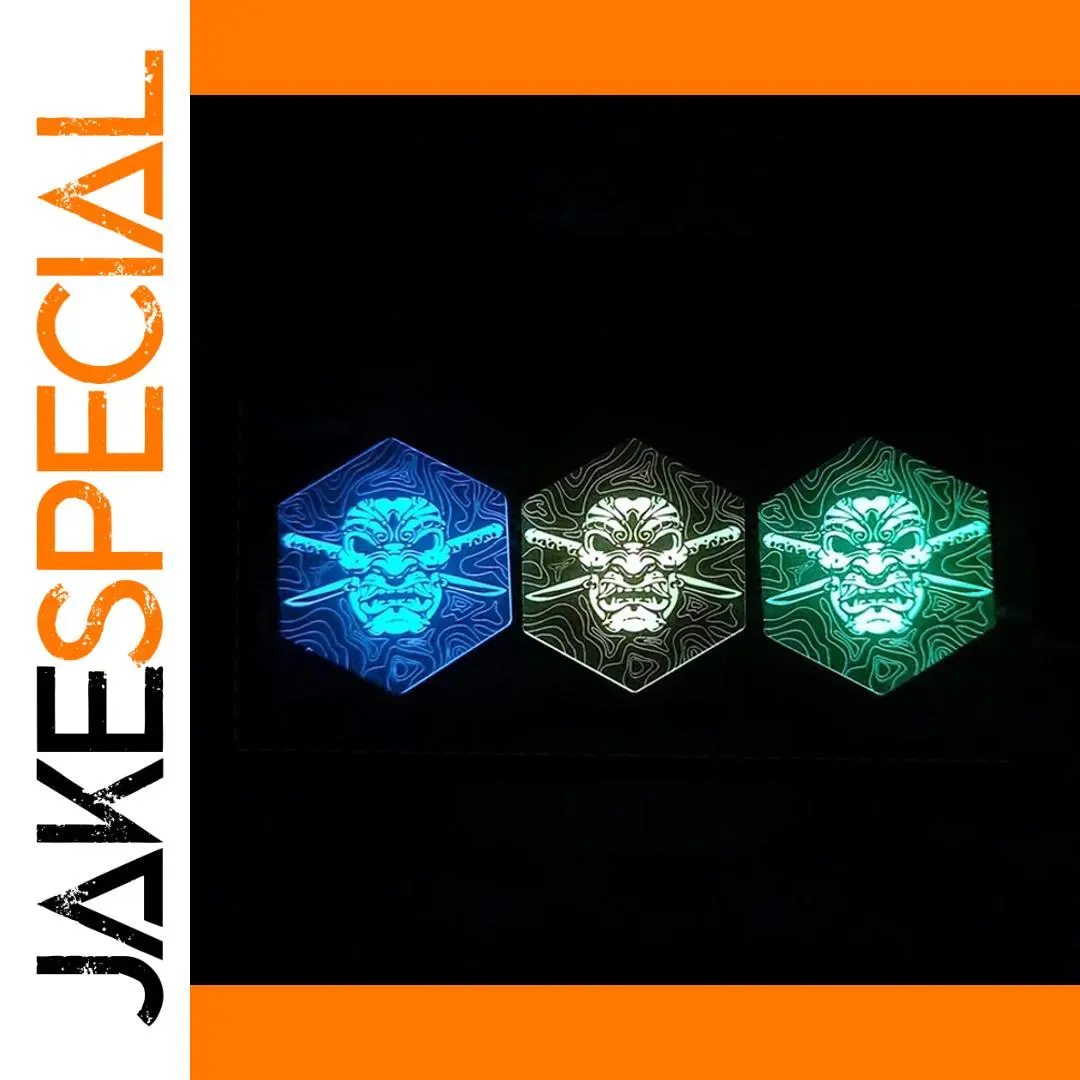 Immerse yourself in the striking artistry of this luminous Samurai Skull embroidery patch. Crafted with intricate embroidered details, it boasts a fierce, stylized skull design surrounded by traditional samurai armor motifs. Illuminated in vibrant blue, white, and green, the patch glows vividly in low light, bringing a modern twist to classic warrior imagery. Made from eco-friendly plastic with a 3D handmade texture, it offers a durable and textured finish. Its hexagonal shape with sharp, clean edges highlights the precise craftsmanship. Perfect for customizing your clothing or backpack, its hook & loop attachment ensures easy application, making it ideal for DIY enthusiasts who appreciate detailed, luminous accessories that stand out.