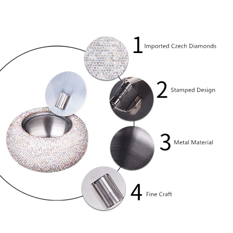 - Technical specifications: Made of stainless steel, encrusted with rhinestones; Dimensions: diameter 10.2cm, height 5cm; Suitable for use in homes, hotels, vehicles, and lounges; Non-toxic, smokeless design, not containing concerning chemicals; Durable and easy to clean.