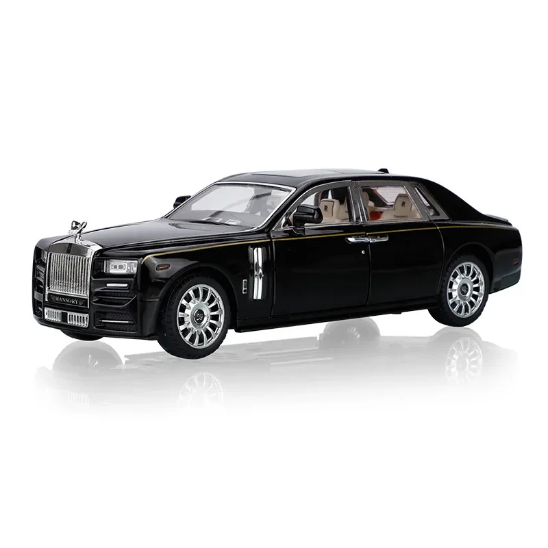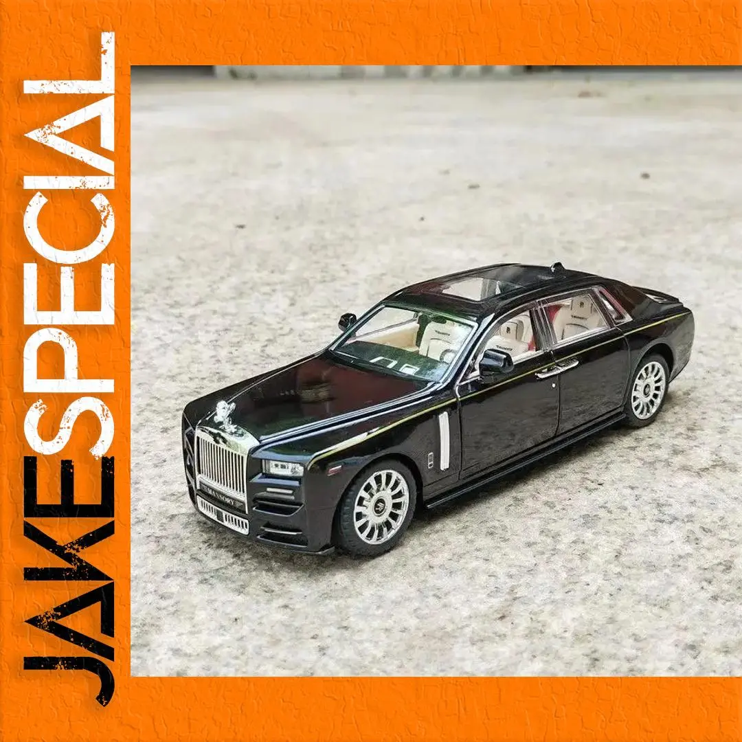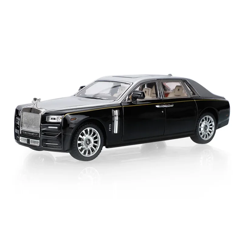 Imagine elevating your collection with this stunning 1:24 scale diecast model of the iconic Rolls-Royce Phantom. Crafted from high-quality alloy metal, it offers a realistic weight and exceptional durability. Its glossy black finish, paired with silver accents along the sides and front grille, captures the luxury and sophistication of the original vehicle. The model features a prominent silver grille with vertical slats, intricate vent details, and authentic headlights with clear covers. Transparent windows reveal a refined beige interior with detailed seats, dashboard, and steering wheel. Additional features include finely shaped side mirrors, door handles, silver multi-spoke wheels with black tires, and a subtly curved roofline. Perfect for display, this model also boasts simulation sound and lighting, making it ideal for enthusiasts who appreciate craftsmanship and realism.