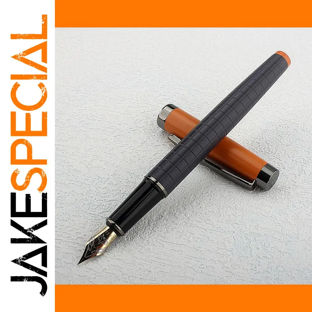Imagine elevating your writing experience with this exquisite luxury fountain pen. Its sleek, elongated body boasts a sophisticated black checkered pattern, embodying modern elegance. The warm, rich orange-brown cap, finished with a glossy sheen, adds a luxurious touch. Metallic silver or chrome accents at both ends provide a polished contrast, making it truly eye-catching. The stainless steel nib, intricately engraved with decorative details, offers both style and precision. Designed for high-end calligraphy, business correspondence, or everyday writing, this pen exudes professionalism and timeless fashion. Its durable metal construction ensures longevity, making it a dependable choice for enthusiasts who appreciate craftsmanship and class. Enjoy a seamless writing experience and impress those around you with every stroke.