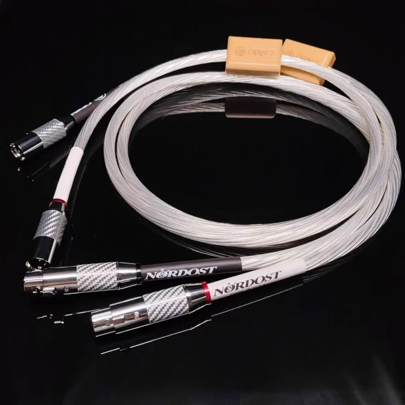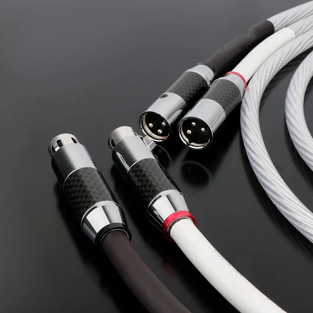 Experience exceptional sound clarity and elegant design with this flagship XLR interconnect cable. Crafted for audiophile-grade performance, it features eight ultra-purity silver-plated conductors wrapped in PTFE insulation, ensuring minimal signal loss. The slim, 8mm diameter cable boasts a glossy, semi-transparent outer sheath that showcases the organized silver cores inside. The high-precision, rhodium-plated XLR male and female connectors are accented with vibrant red and black rings, adding a subtle splash of color and aiding in quick identification. Detailing like the carbon fiber accents on the connectors highlights meticulous craftsmanship. Designed to provide a balanced, clean sound, this product enhances your listening experience across all frequencies, making it ideal for home audio, studio setups, and high-end entertainment systems.
