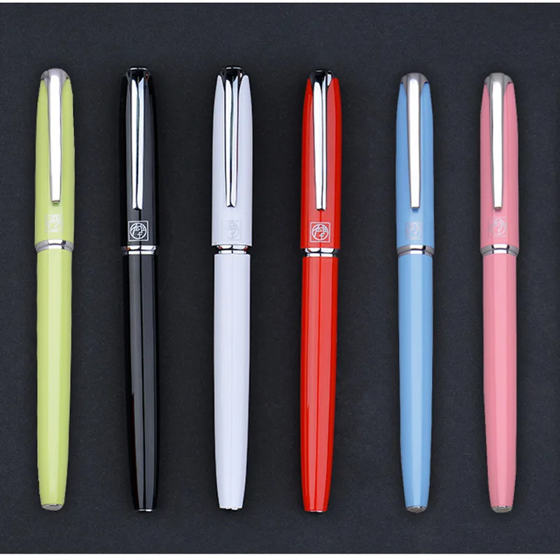 Experience the timeless allure of this this luxury 916 fountain pen, crafted with precision to elevate your writing experience. Weighing 35 grams, it features a sleek, metal body with a polished finish that exudes sophistication. Available in a variety of vibrant colors—black, orange, white, light green, sky blue, red, and pink—it complements your personal style perfectly. The designer cap tapers slightly toward the top, crowned with a refined pointed, curved decorative element that adds a subtle touch of elegance. When you remove the cap, the shiny metallic nib is revealed, reflecting light and highlighting its intricate craftsmanship. The textured grip ensures comfort during extended writing sessions. This high-quality pen truly combines modern aesthetics with classic luxury for any writing enthusiast.