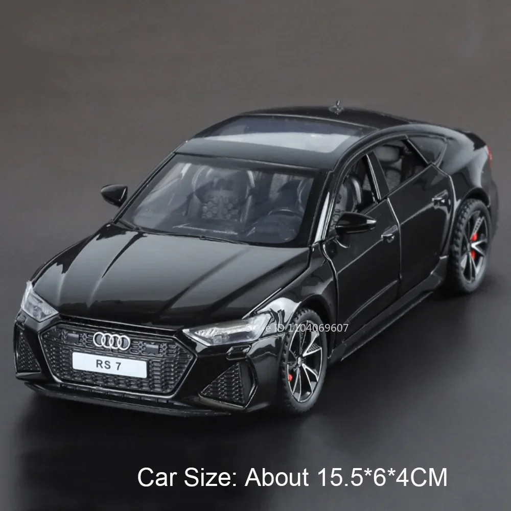 Experience the thrill of high-performance design with this meticulously crafted 1:32 scale RS7 model car. Its sleek, aerodynamic shape showcases smooth curves and sharp, precise lines, perfectly capturing the essence of a luxury sports vehicle. The glossy black finish adds elegance and sophistication, making it an eye-catching ornament. Realistic details include a distinctive front grille with the four interlinked rings emblem, sharply designed headlights with internal detailing, sporty air intakes, and dimmed windows that enhance authenticity. The side mirrors are compact and aerodynamically styled, while the inset door handles and subtle panel lines contribute to seamless realism. This model embodies modern automotive aesthetics, offering both beauty and durability to any collection.