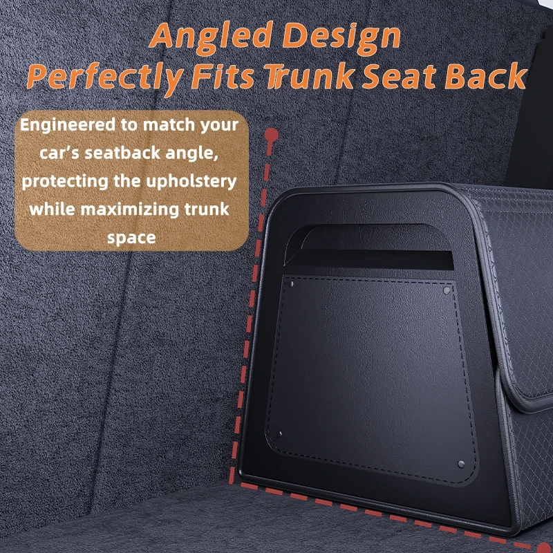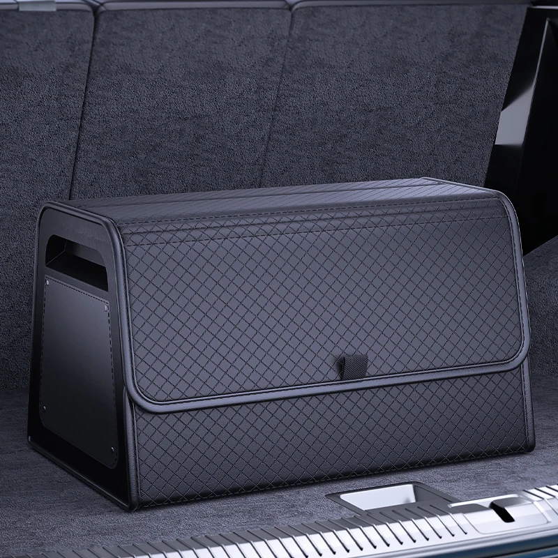 Experience the perfect blend of style and practicality with this premium car trunk organizer. Crafted from high-quality PU leather with a textured quilted diamond pattern, it adds a luxurious touch to your vehicle’s storage space. The tapered rectangular design offers a sleek silhouette, while the reinforced ABS frame guarantees stability and durability during transit. Its odor-free 4-layer construction—including soft high-density sponge, reinforced PVC core, and tough Oxford fabric—ensures a clean and fresh environment. Available in two versatile sizes, it adapts seamlessly to your needs, whether for your SUV, sedan, or home storage. The adjustable, removable dividers allow for personalized organization, helping you keep groceries, tools, or pet supplies neatly arranged. Enjoy peace of mind with the secure magnetic closure system that remains firmly shut, even during sudden stops.