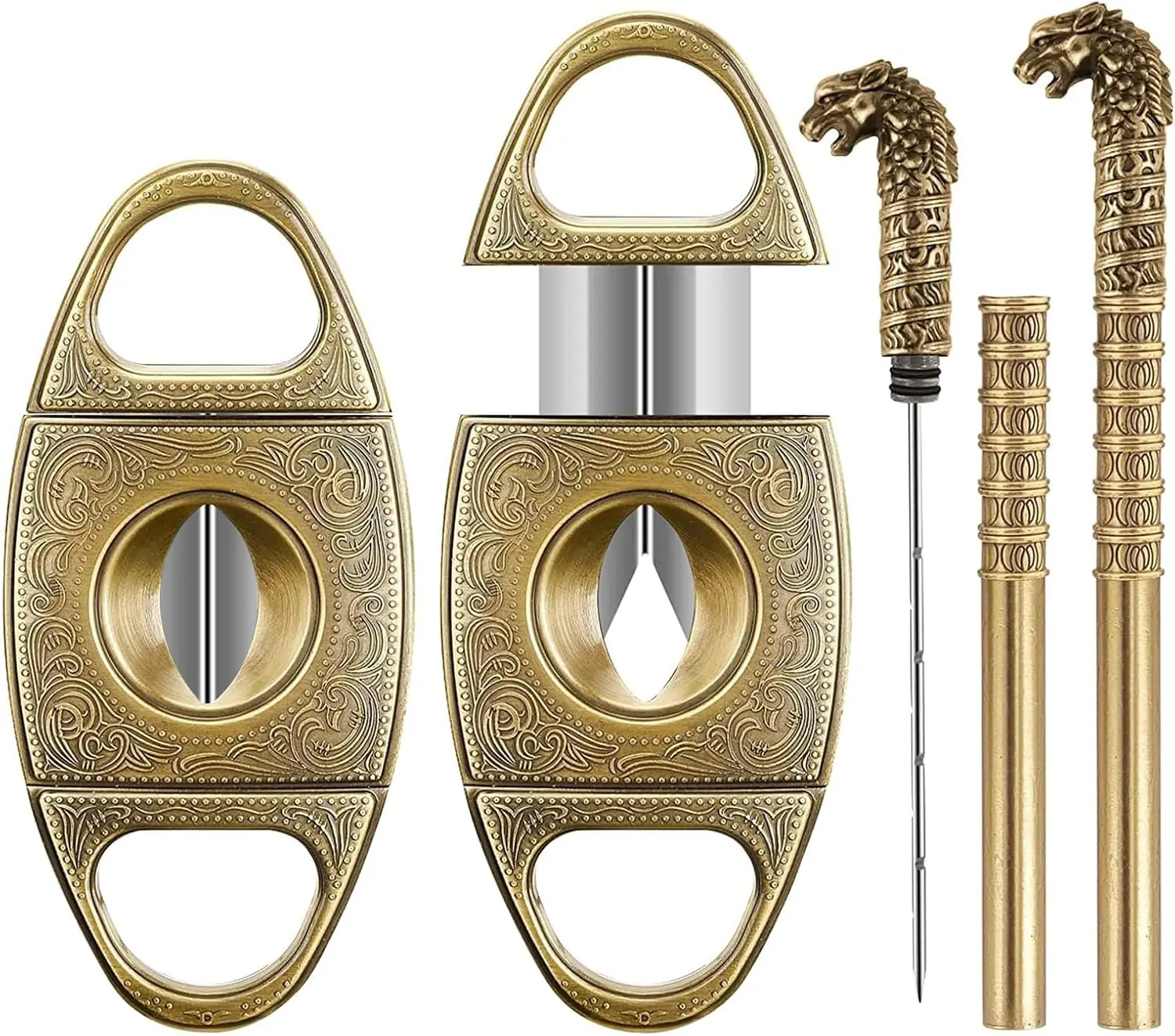 Experience the perfect blend of elegance and functionality with this high-end cigar accessories set. Designed for discerning cigar enthusiasts, it combines refined aesthetics with precise craftsmanship. The set includes a sleek V-cut cigar cutter made of alloy and stainless steel, featuring a luxurious brushed finish and intricate engraved floral patterns, offering a clean cut that preserves cigar flavor. The bronze-colored draw enhancer tool, adorned with a carved leopard head, improves airflow and alleviates overfilled or tight cigars, making every puff smoother. Packaged in a stylish gift box, this set elevates your cigar time while making a thoughtful gift for lovers of fine cigars. Whether for personal enjoyment or gifting, it’s a must-have for refined cigar aficionados.