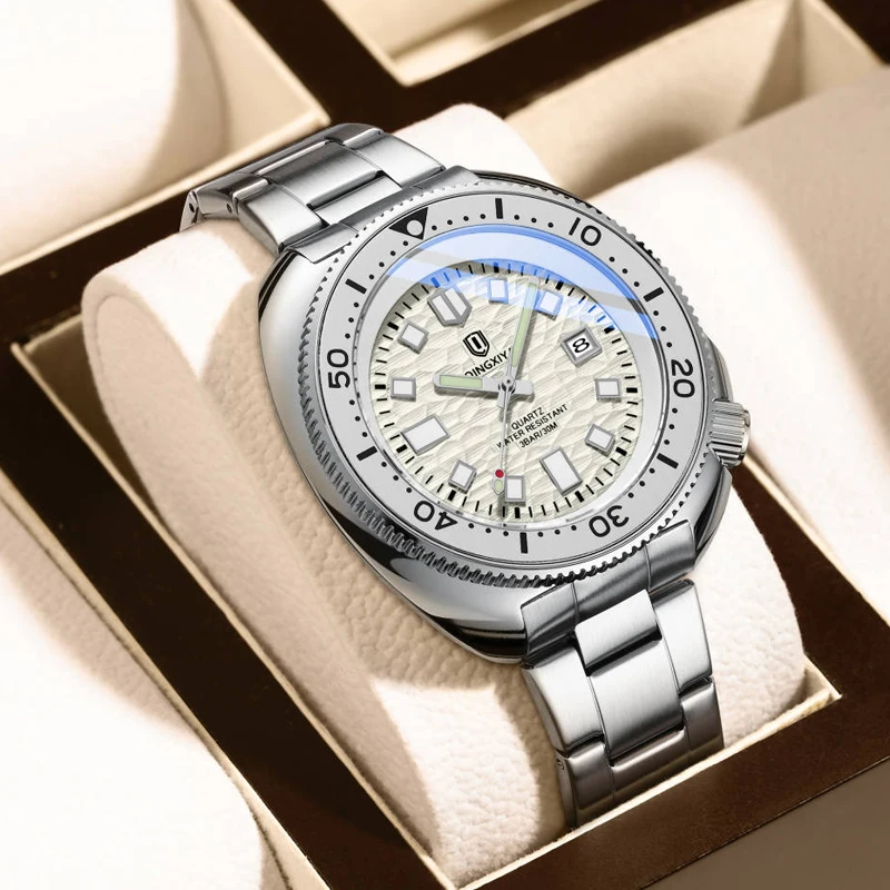 Elevate your style with this Brand Luxury Men’s Quartz Watch Model 6672. Featuring a polished silver alloy case with a diameter of 40.5mm and a thickness of 13mm, this watch combines substantial presence with refined elegance. The textured silver dial showcases luminous hands and geometric hour markers, complemented by a date window at three o’clock. Its stainless steel band is 240mm long and 19mm wide, secured by a folding clasp with safety, while water resistance up to 3Bar adds practicality. Weighing 127g, this timepiece is available in white, blue, and black, perfect for any occasion.
