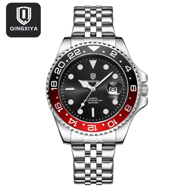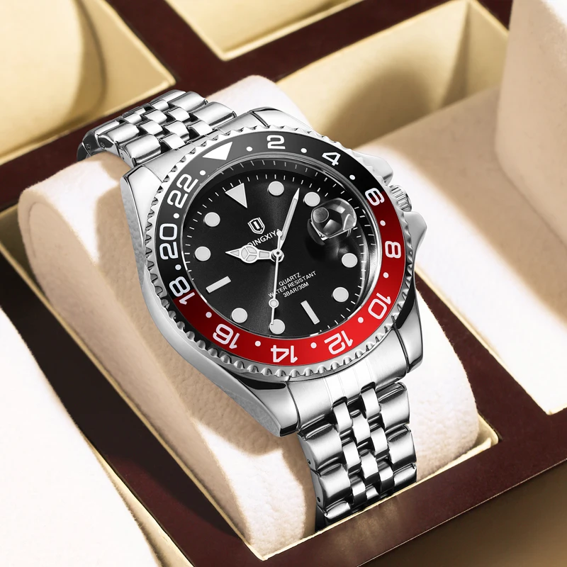 - Stylish black unidirectional bezel with red accents for a modern touch.