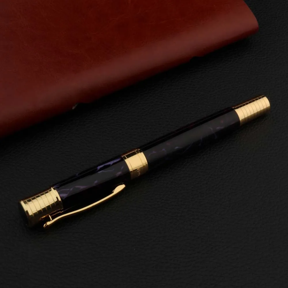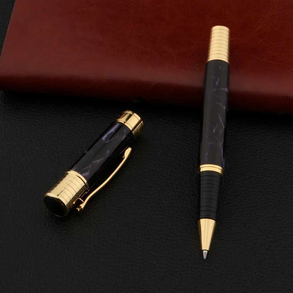 Experience the perfect blend of sophistication and functionality with this luxury metallic rollerball pen. Its striking marble purple body exudes elegance, while the shiny gold accents on the cap, clip, and grip section add a touch of luxury. Designed for those who value style and practicality, this pen offers smooth, precise writing with a 0.7mm point and black ink. Made from durable metal, it ensures longevity and a comfortable grip, whether for professional office use or academic settings. Its sleek minimalist design enhances any workspace, making a statement of refined taste. Feel confident in your writing instrument, elevating your everyday tasks with this luxurious tool that combines aesthetic beauty with reliable performance.