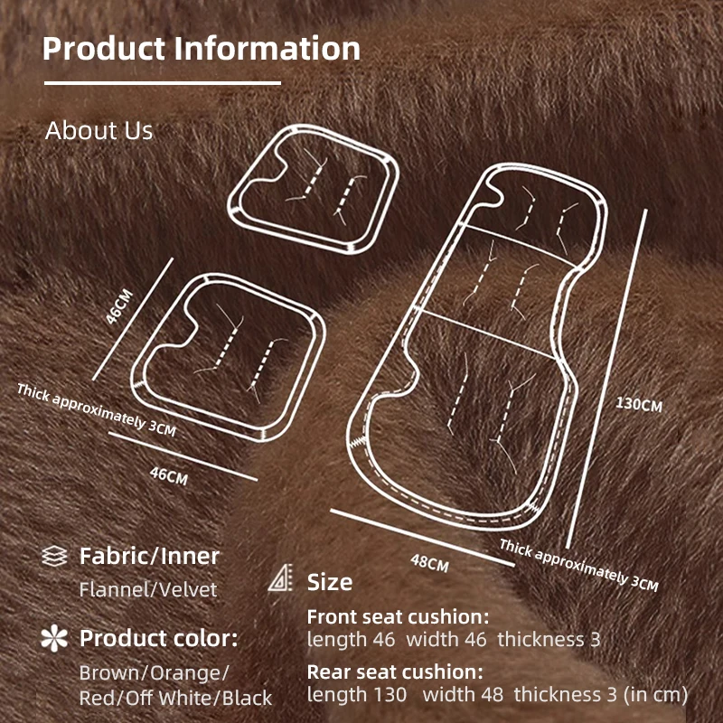 Transform your vehicle’s interior with this luxurious seat cover set featuring plush cushions made from high-quality flannel fabric with a velvet inner core. The front cushions measure 46×46×3 cm, while the rear bench cushions are 130×43×3 cm, offering a precise fit for various models. Designed with anti-slip particles for secure placement and a supportive Q-shaped structure to reduce muscle fatigue on long drives, these cushions also feature a innovative three-layer temperature-locking system to prevent cold transfer and keep you warm during winter. Available in versatile colors including black, brown, orange, red, and white, they effortlessly combine style, comfort, and practicality to elevate your driving experience.