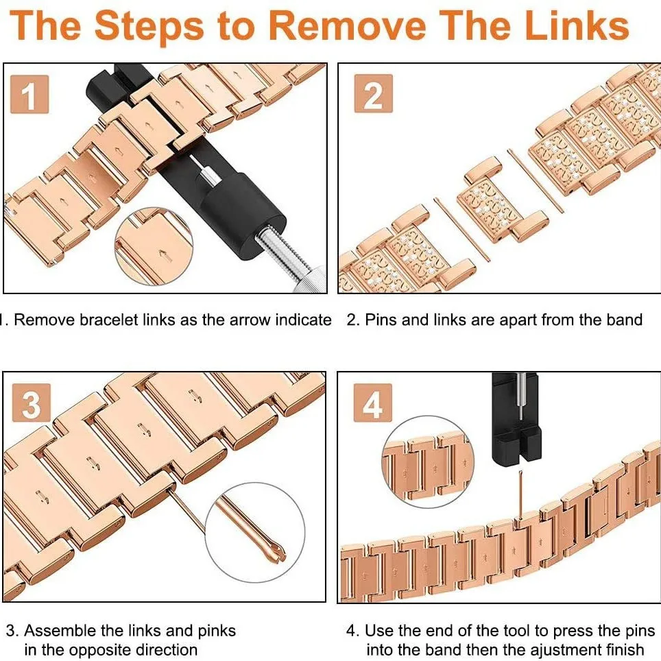 Enhance your Huawei smartwatch with this luxurious unisex stainless steel band, compatible with models GT5 (41mm and 46mm), GT4, GT3, GT2e, GT2, GT3 Pro (46mm), GT2-GT3-GT3 Pro (42mm), Huawei Watch 4 and 4 Pro, and 3 and 3 Pro. Featuring a polished, shiny finish, it showcases intricate metallic links embedded with sparkling diamonds on the clasp and central sections of each link for an elegant, high-end look. Available in diverse colors including black, colorful, gold, pink, retro gold, rose gold, and silver, with customizable sizes for both 41mm and 46mm cases, this stainless steel band perfectly combines durability and sophistication for any formal or upscale casual occasion.