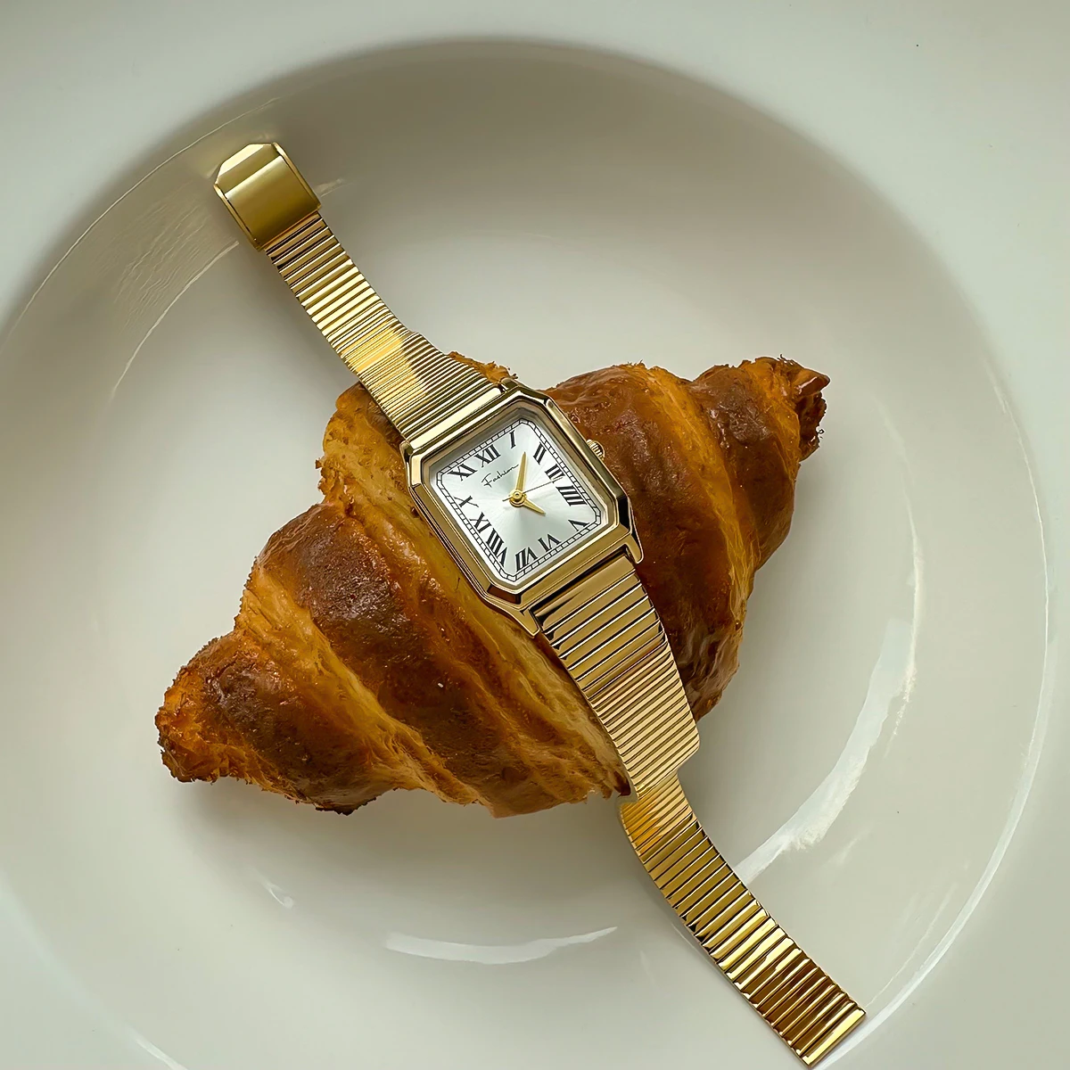 - Includes seven watches with diverse face shapes like square, rectangular, and oval, each featuring minimalist white dials with gold Roman numerals and sleek gold hands for a contemporary look.