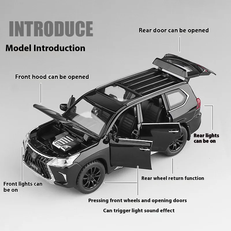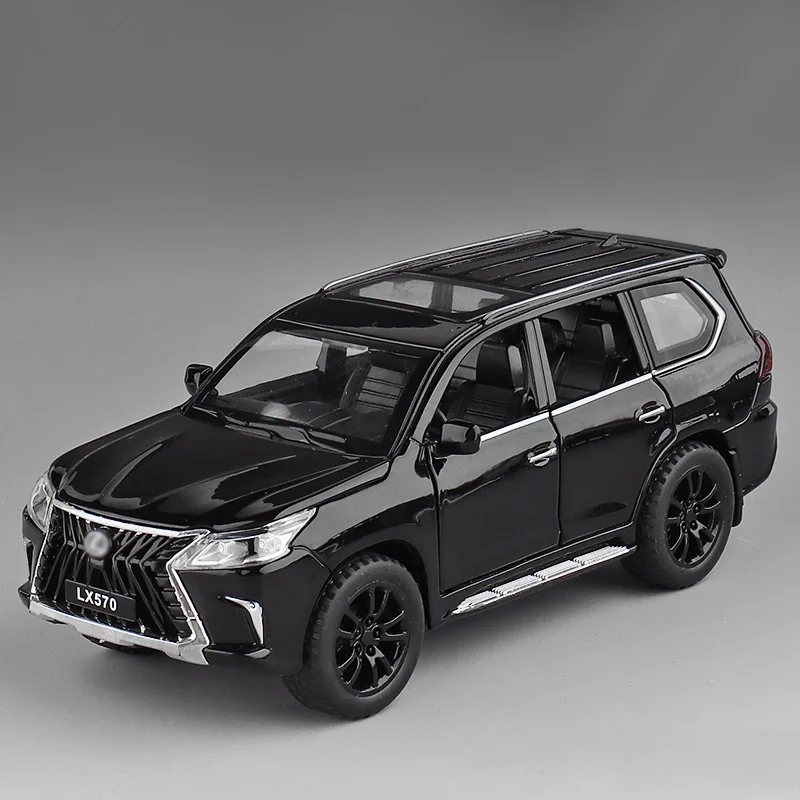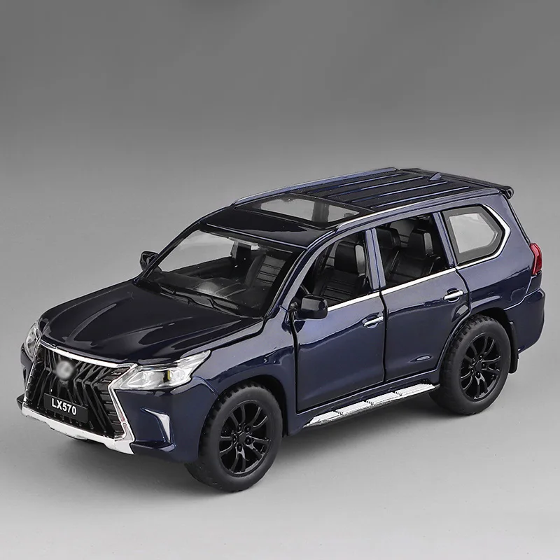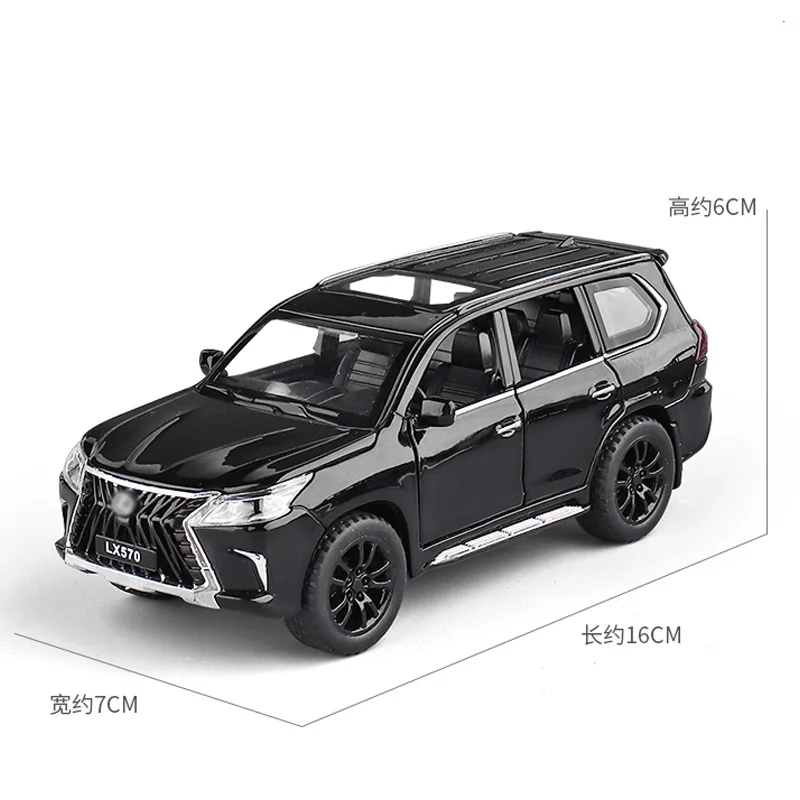 The LX570 alloy model car is an exquisite 1:32 scale replica, meticulously crafted from zinc alloy and weighing 0.43 kg. It features a stunning light gold metallic finish that reflects light beautifully. The realistic design includes a striking front grille with vertical chrome slats, detailed black alloy wheels, and precisely molded doors with clear windows revealing a detailed interior. This model showcases faithfully rendered headlights and tail lights, along with the “LX570” branding on the front bumper, making it an ideal decorative ornament for car interiors or a thoughtful gift for automotive enthusiasts. Available in blue, gold, black, and white color options.