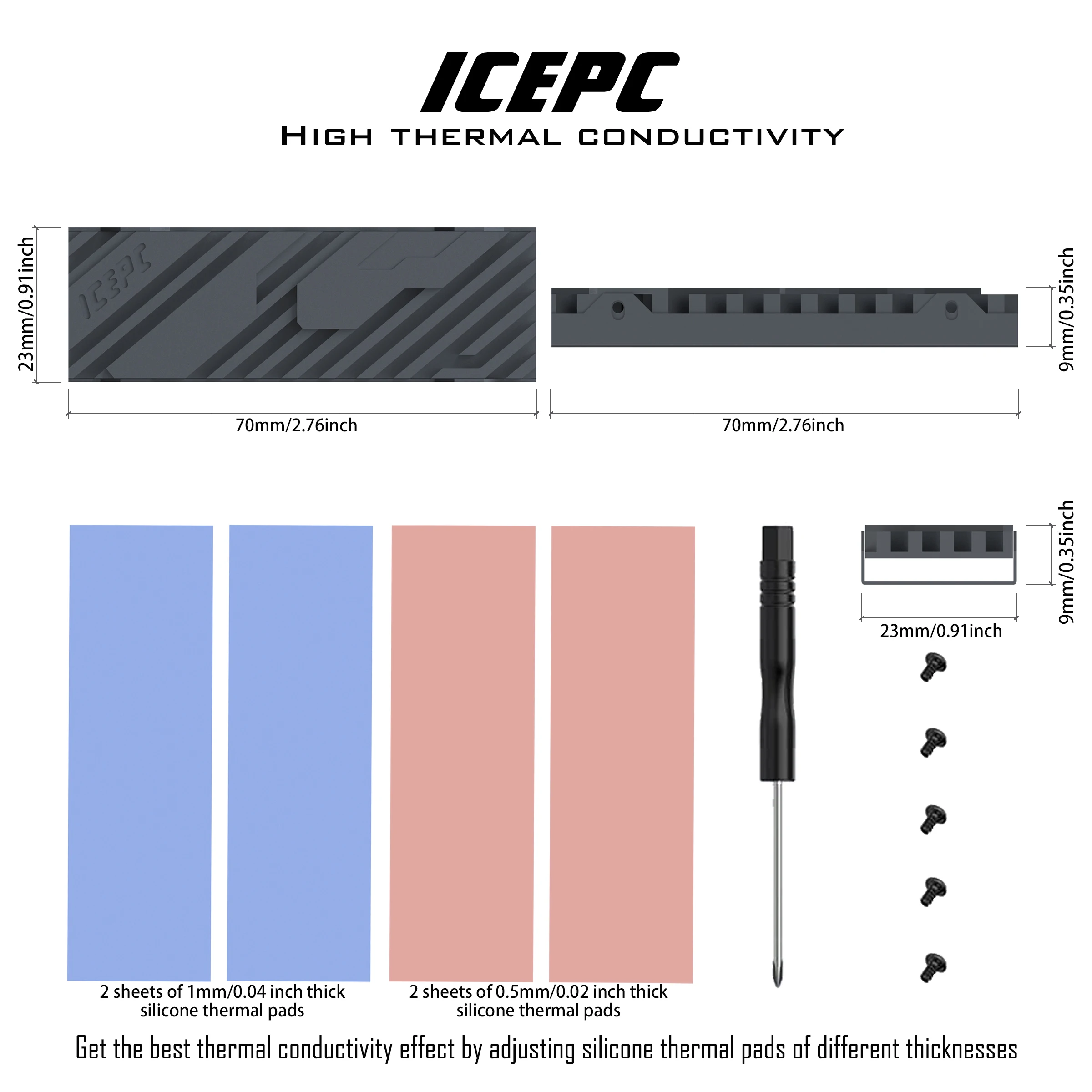 Experience unparalleled thermal management with the iCEPC M.2 NGFF NVME Copper Heatsink. Measuring 70x23x9mm and weighing a mere 53g, this sleek and compact heatsink is expertly designed to keep your M.2 2280 SSDs cool during intense usage. Constructed from high-quality copper and graphene material, it boasts a remarkable thermal conductivity rating of 5300 W/m·K, ensuring optimal performance for your devices. The polished surface enhances heat contact efficiency, while the rugged texture and fins reinforce airflow. With reliable installation accessories included, you’re just one step away from elevating your SSD performance and ensuring longevity.