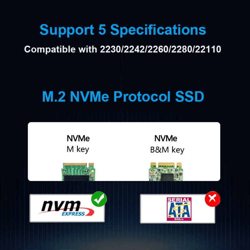- Accommodates M.2 SSDs in sizes 2230, 2242, 2260, 2280, and 22110, offering versatile upgrade options for various motherboard configurations and storage needs.
