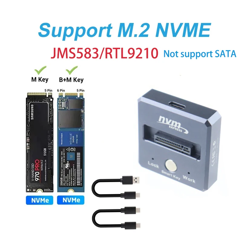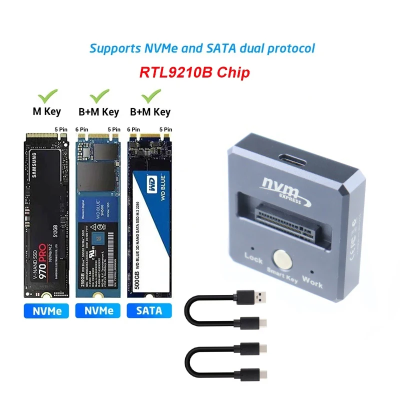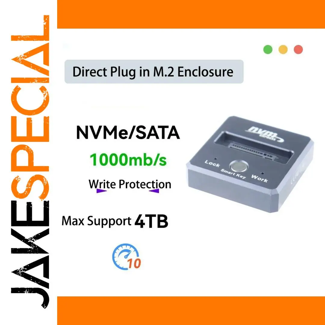 - Supports both NVMe and SATA protocols (excluding some M.2 SATA SSDs with incompatible chips), allowing flexible usage with compatible drives up to 4TB capacity.