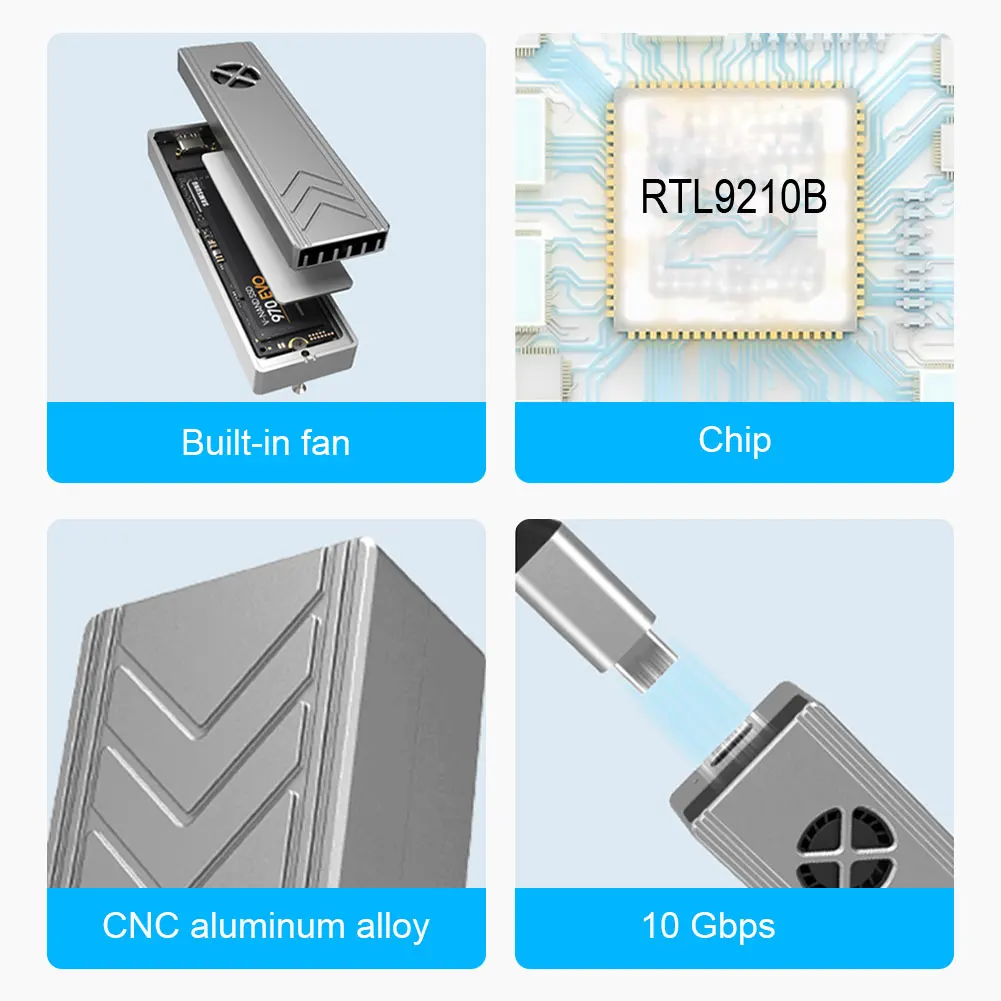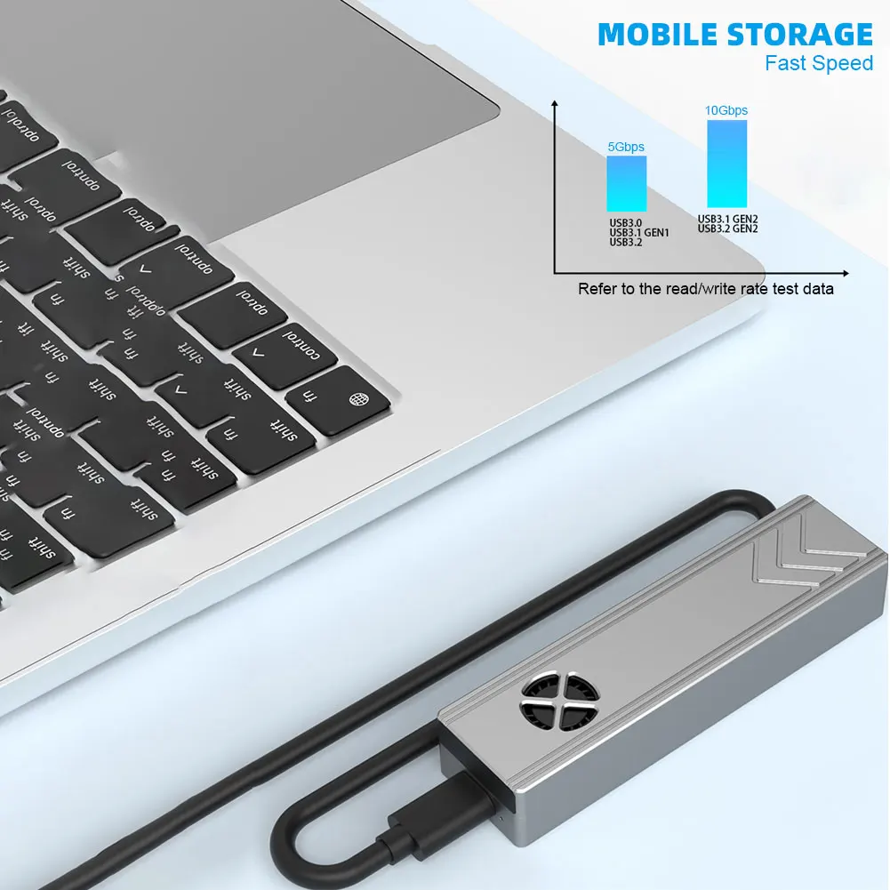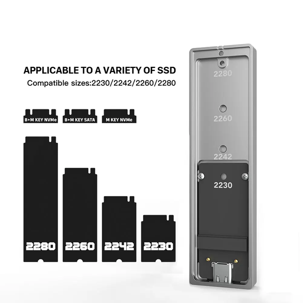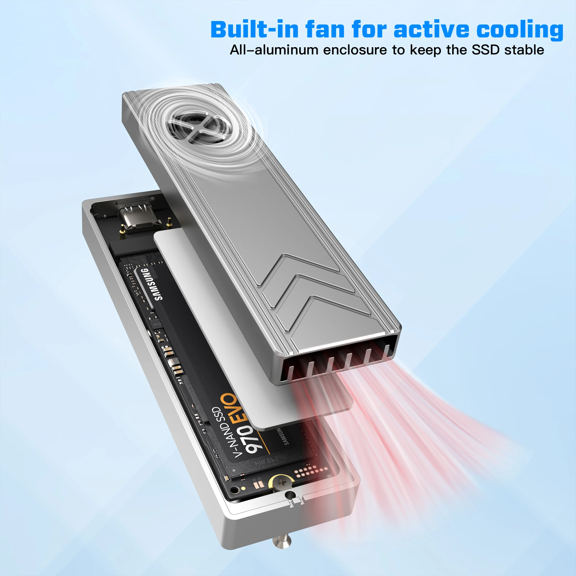Experience fast and reliable storage with this Dual Protocol M.2 SSD enclosure, measuring 109×28×14.5mm and crafted from premium aluminum with a sleek sandblasted and oxidized finish in matte silver-gray. It supports M.2 NVMe and SATA SSDs with M-Key and B+M Key for sizes 2230/2242/2260/2280, and handles capacities up to 4TB (SSD not included). The built-in fan ensures efficient heat dissipation, while USB 3.2 Type-C offers blazing transfer speeds up to 10Gbps—20 times faster than USB 2.0. Its tool-free, slide-open design with versatile connectivity options makes it perfect for on-the-go professionals.