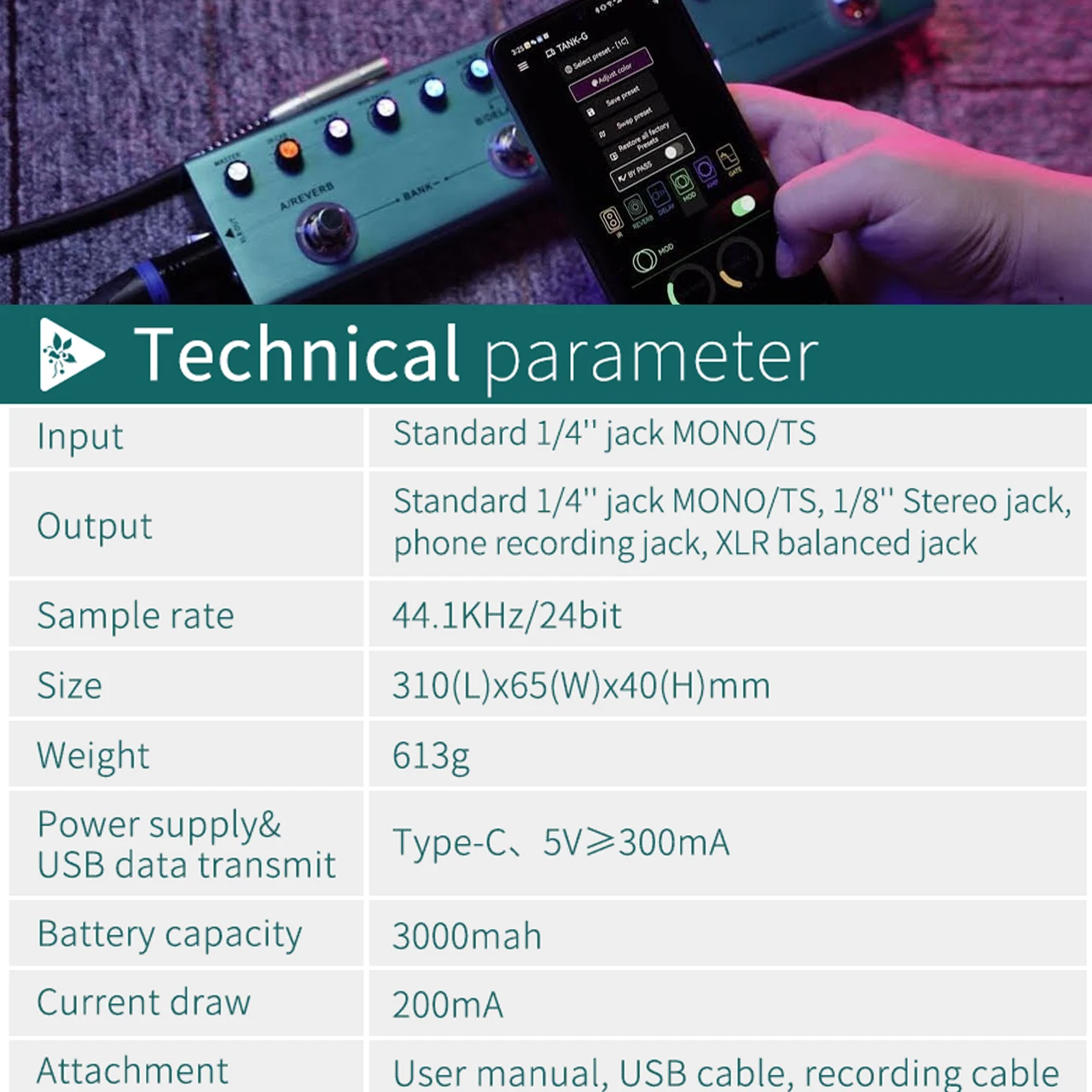 Step into a world of exceptional sound with this this M-VAVE Tank-G Guitar Multi-Effects Pedal, designed for both guitar and bass players who crave flexibility and quality. With 36 editable presets, 9 preamp slots, and 8 IR cabinet slots, it offers an extensive range of tones. Its sleek, modern design features a vibrant turquoise back panel with a matte finish, complemented by black textured control knobs and clear labels, ensuring ease of use. The pedal's built-in rechargeable 3000mAh battery and support for wireless connectivity, software editing, and sharing make it perfect for performances, practice, or studio sessions. Its compact size and lightweight construction provide portability without sacrificing performance or versatility, making this an essential addition for musicians seeking professional sound on the go.