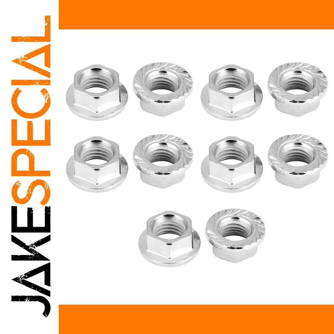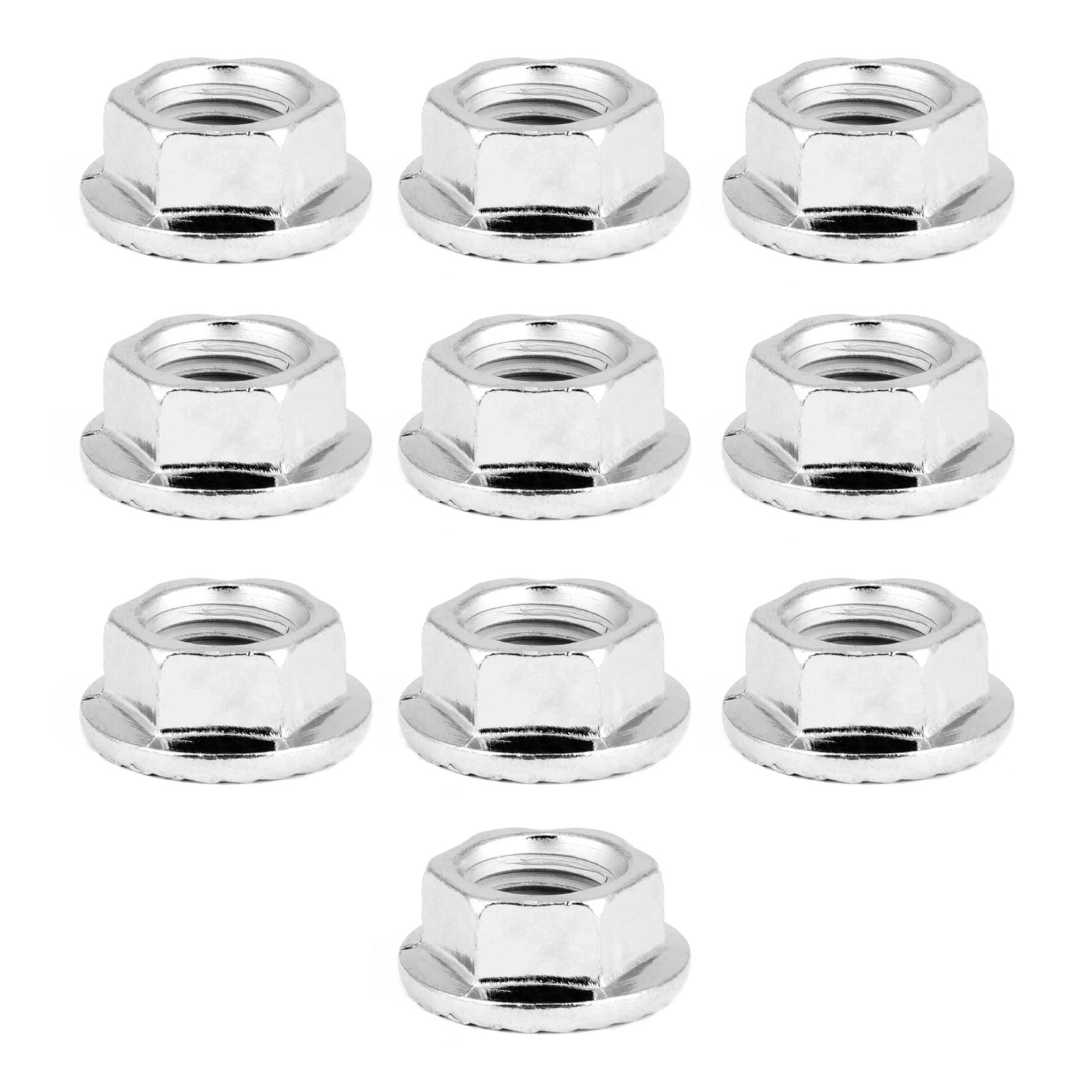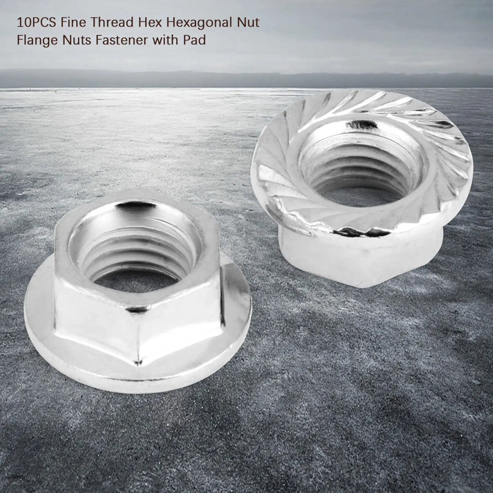 Imagine securing your projects with this high-quality set of 10 silver-colored flange nuts. Crafted from durable iron chrome, these nuts feature a sleek, polished finish that resists corrosion, ensuring long-lasting performance. The flat, broad flange distributes pressure evenly, making them ideal for machinery, home appliances, communication devices, and ship assembly. With a precise M10 x 1.25 fine thread, these nuts are designed for easy installation and reliable fastening. Their hexagonal shape provides six efficient gripping points for your tools, enhancing ease of use and safety. Whether replacing worn parts or building new structures, these nuts combine strength with a visually appealing metallic shine—perfect for professional and DIY applications.