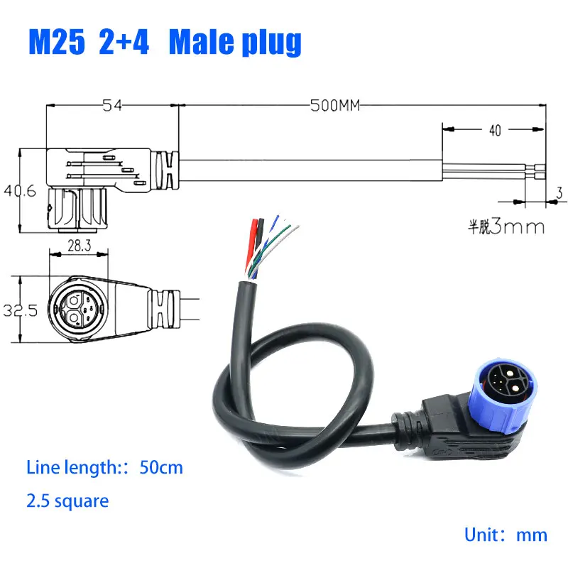 This modern and durable M25 2+4 Battery Connector set offers a seamless connection solution for electric vehicle batteries and charging systems. Featuring a 24V operating voltage, these waterproof in-line connectors are designed with precision, combining black plastic (PA66 shell) with gold-plated contact points for optimal conductivity and corrosion resistance. The 50cm energy storage cable provides flexibility for installation, with a 2.5 mm² cross-sectional area suitable for high-current applications. Its streamlined circular design with smooth edges ensures ease of connection and a secure fit. Waterproof seals, highlighted by vibrant red rubber rings, enhance durability against environmental elements. Sleek and practical, this set supports reliable energy transfer in shared bicycles, tram systems, and charging stations while maintaining a modern industrial aesthetic.