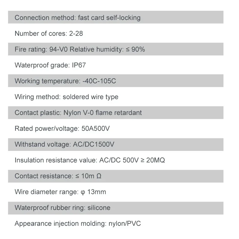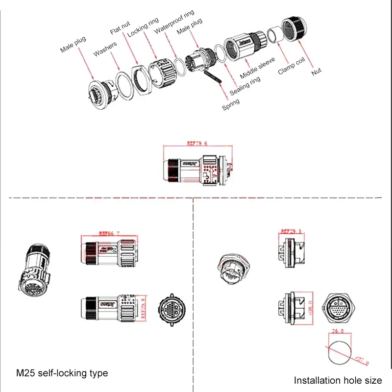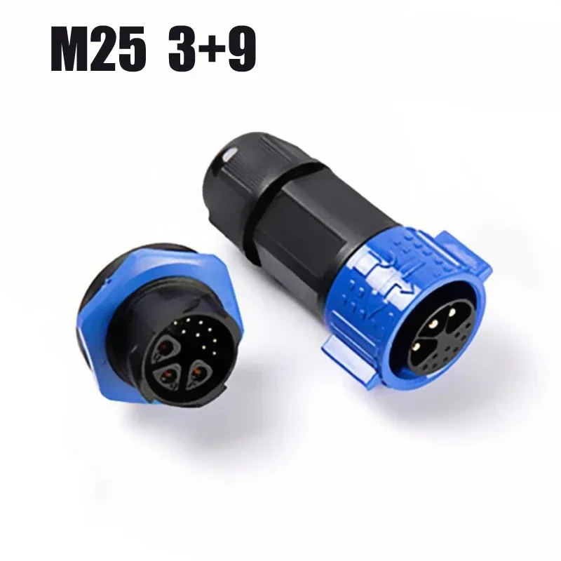 The M25 3+9 Pin Aviation Plug features a robust IP67 waterproof assembled connector with a 12-pin male and female socket configuration, rated for 20A and 300V. With an outer diameter of 16mm and a 25mm² cross-section area, it is constructed from high-performance engineering insulation material, ensuring durability in temperatures ranging from -40°C to 105°C. Designed for power and signal applications, this connector utilizes a self-locking docking mechanism for a secure, reliable connection, making it ideal for demanding environments such as military and aerospace fields, combining rugged protection with precise, high-quality engineering.