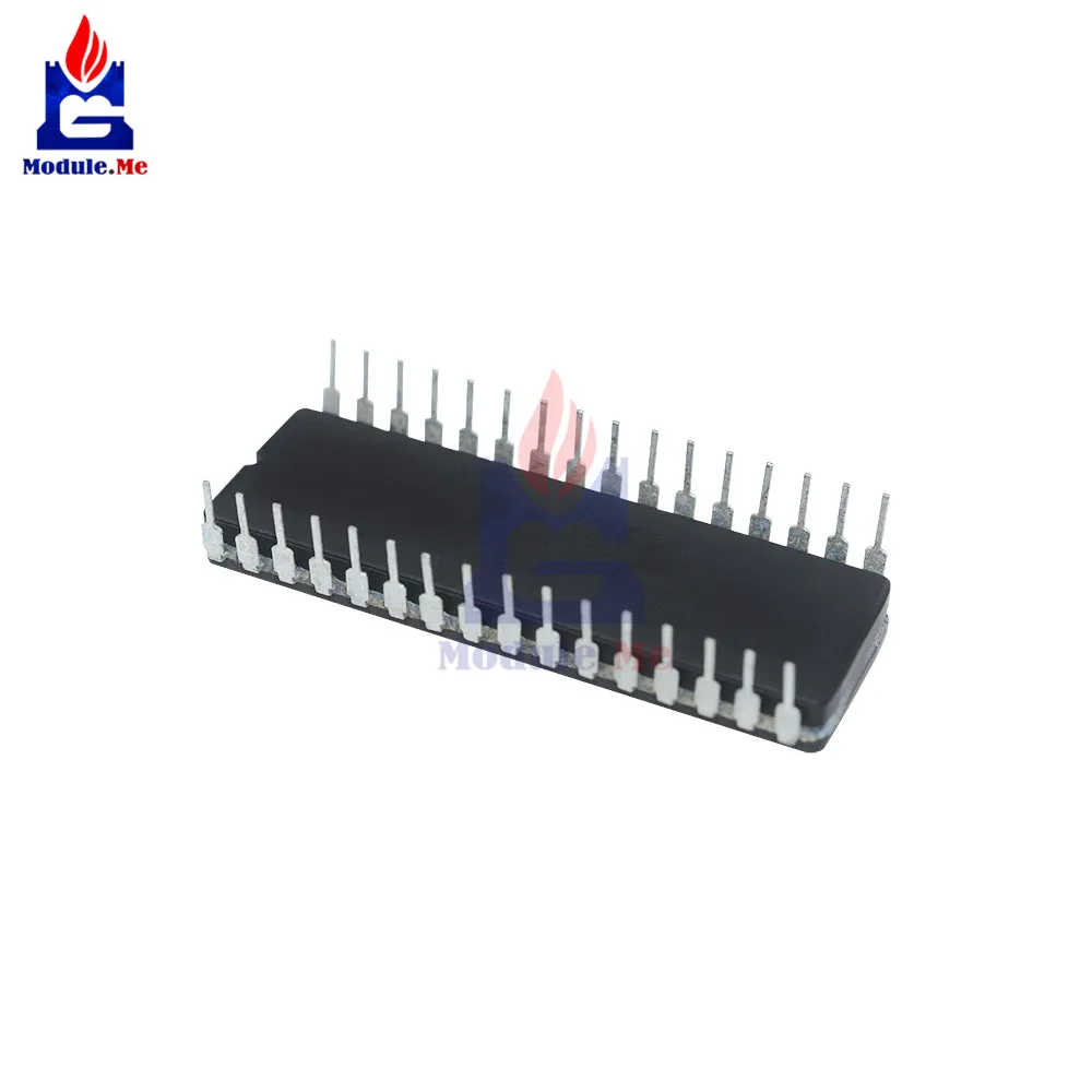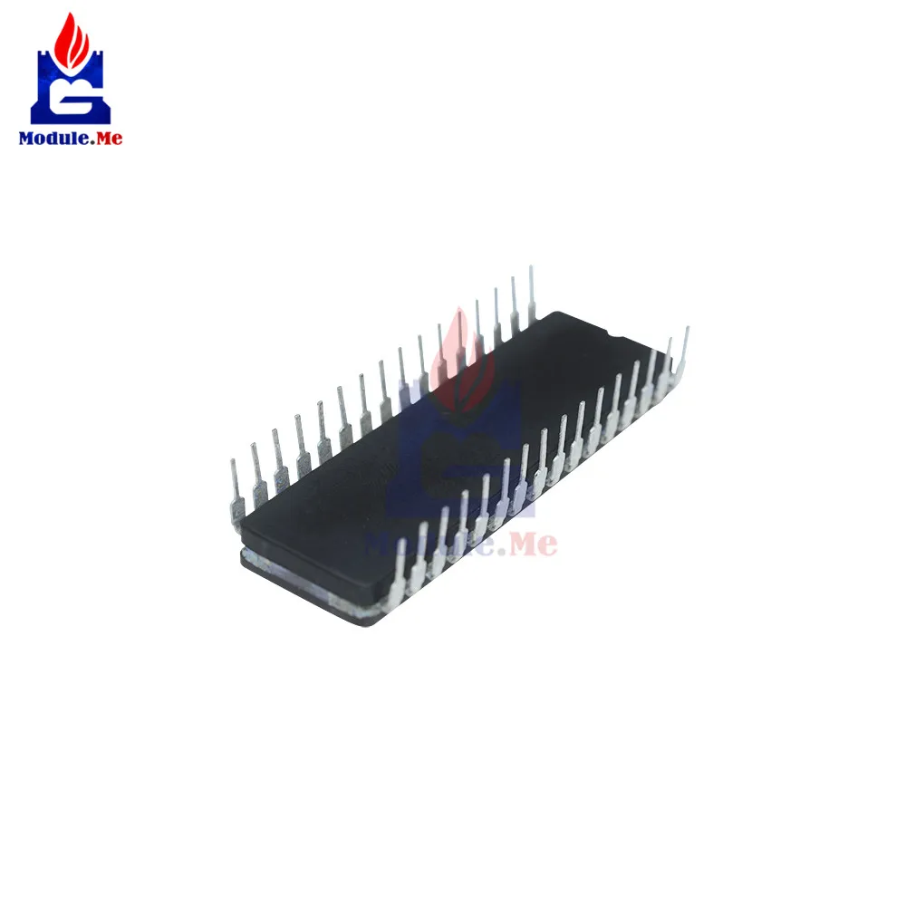 - Designed with a 32-pin dual in-line package (DIP), allowing for easy insertion into standard circuit boards, with evenly spaced metallic pins that are slightly bent downward for secure connection.