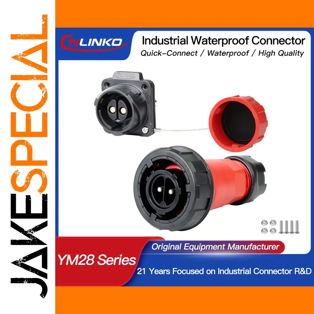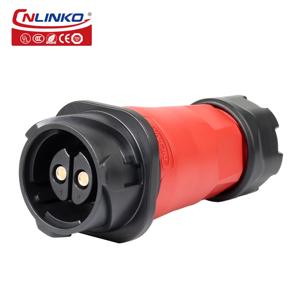 Experience reliable power connections with this robust M28 waterproof connector, designed for outdoor and industrial environments. Its bold red and black cylindrical body exudes a durable industrial aesthetic, combining high-performance engineering plastic with weather-resistant features. The connector’s prominent circular front face features two metal contact pins, arranged vertically for secure electrical connections. With the screw-on locking ring, it offers a tight, waterproof seal rated IP68, protecting against dust and water ingress. The matching socket or plug shell maintains a consistent look, complemented by an attached red protective cap that shields the contact points from environmental contaminants. Perfect for demanding applications, this connector ensures high-quality, secure, and weatherproof electrical connections in harsh conditions.