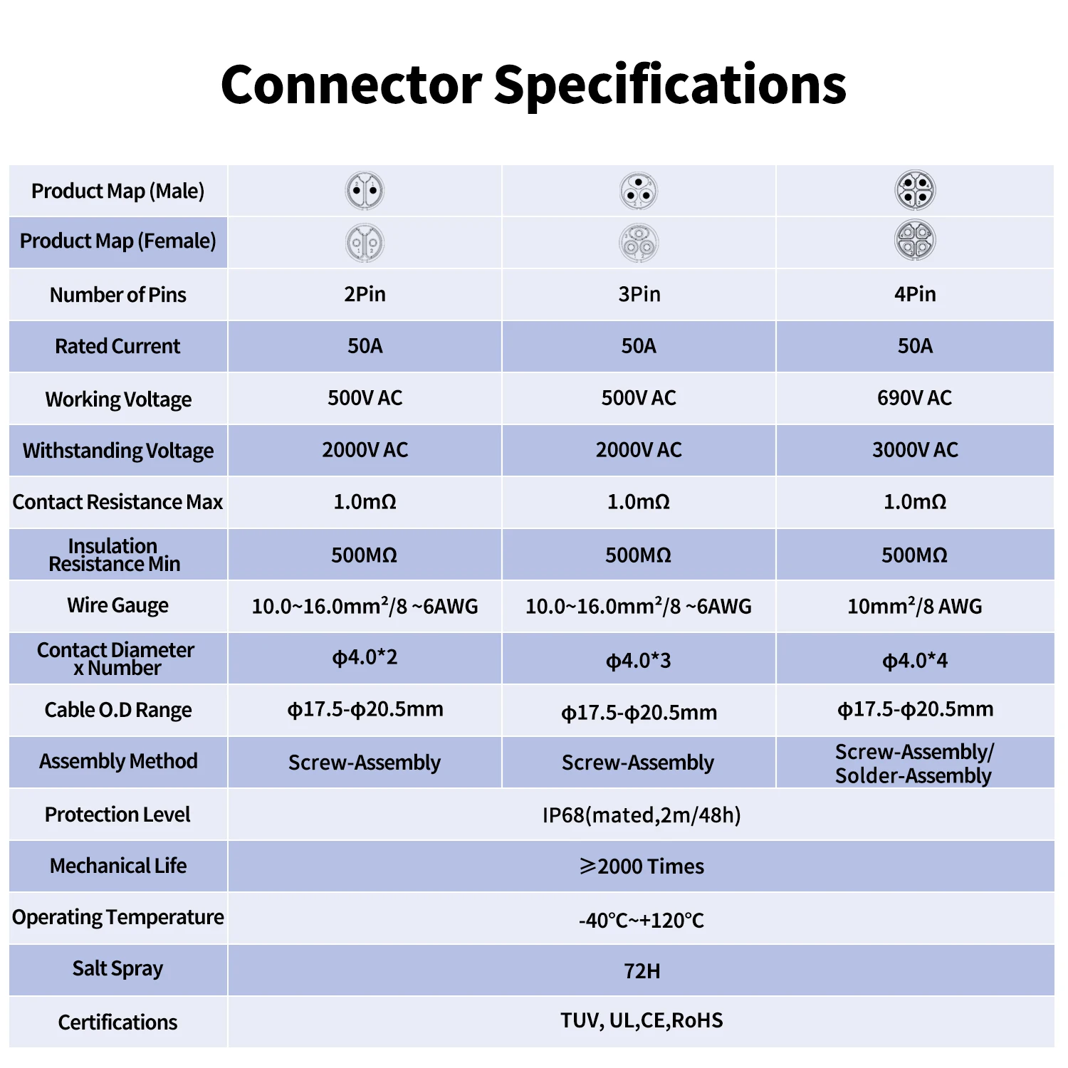 - Rated for 50A current at up to 500V AC on 2/3-pin models and 35A at 690V AC on 5-pin versions, suitable for high-capacity power transmission.