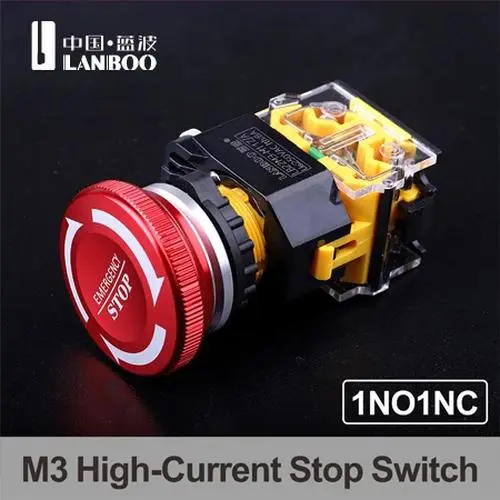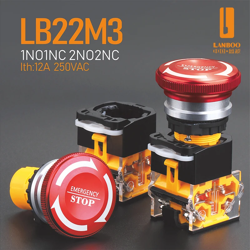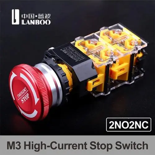 The M3 series 22mm emergency stop switch features a durable stainless steel construction with a high-quality silver contact internally. Designed with an anti-slip, self-locking, latching mechanism and a textured aluminum oxide shell, it offers a bold red operation button measuring approximately 40mm in diameter with white “EMERGENCY STOP” text and an arrow symbol for clear activation. Rated for 8A current at 250VAC, it provides configurable contacts—1NO1NC or 2NO2NC—with a mechanical life of up to 10,000 cycles. Certified by CCC, CE, CQC, and ROHS, this industrial-grade switch combines robust performance with a high-grade appearance, ideal for safety-critical applications.