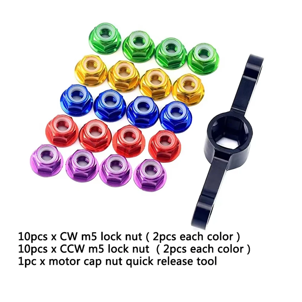 Experience peace of mind with this set of 20 high-quality M5 aluminum flanged lock nuts, meticulously designed for RC FPV racing drones. The vibrant anodized blue finish gives each nut a sleek, modern look while ensuring durability and corrosion resistance. Featuring precise machining and a smooth surface, these nuts provide a secure fit onto brushless motors ranging from 1800 to 2400 KV, including popular models like RS2205, 2204, 2205, 2206, 2305, and 2406 with M5 shafts. The set includes both clockwise (CW) and counter-clockwise (CCW) nuts, tailored to fit motor shafts in different rotation directions. Paired with the included quick-release wrench, mounting and dismounting are quick, effortless, and reliable. This premium set ensures your propellers stay tightly secured during high-speed flights, enhancing your flying experience with trust and reliability.