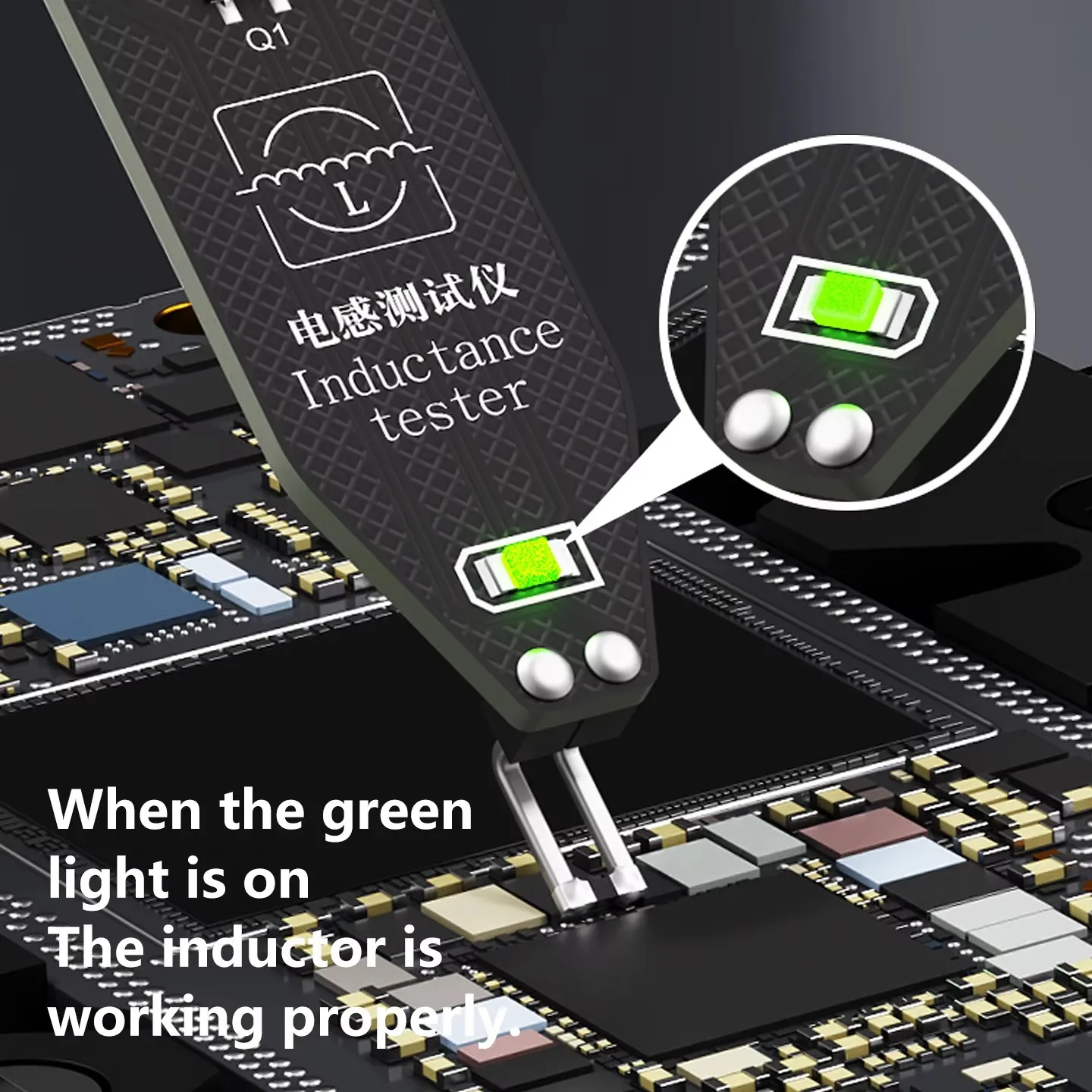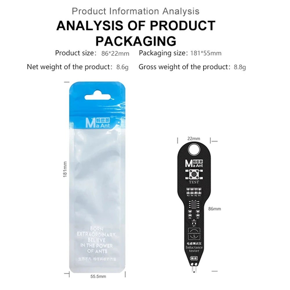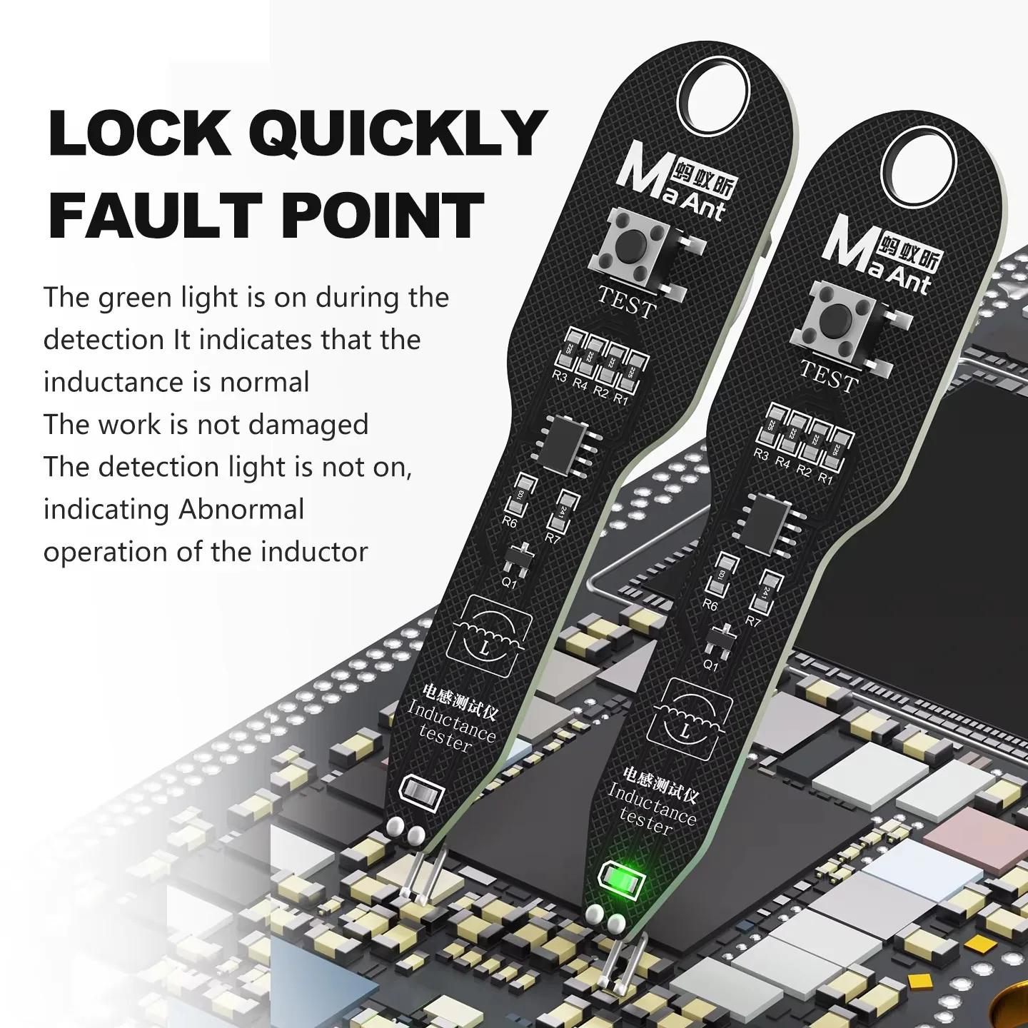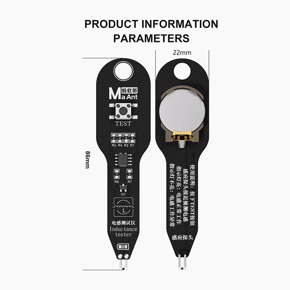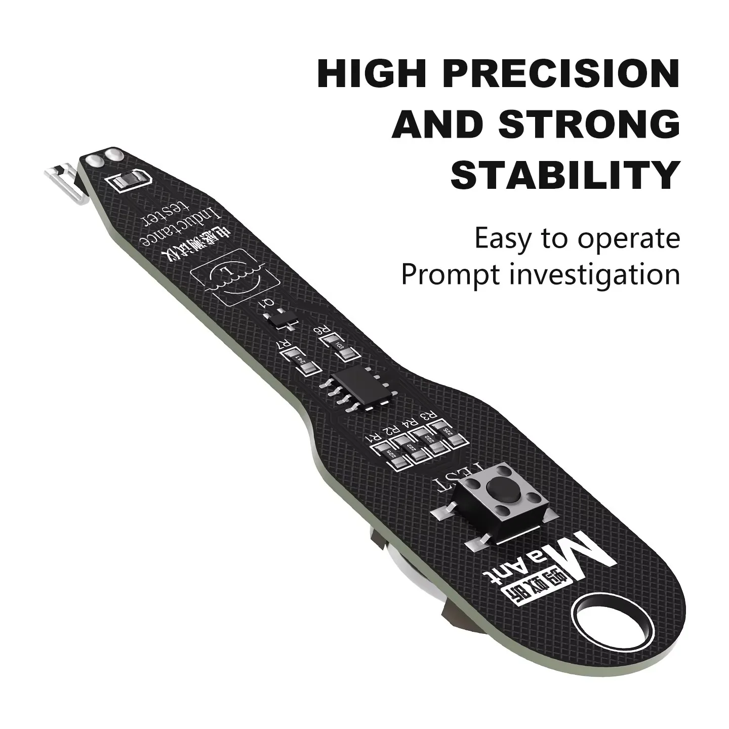 The MaAnt M093 Inductance Tester is a sleek, compact device measuring 86mm by 22mm, weighing only 8.6 grams for easy portability. Designed for motherboard repair, it features a front-mounted inductive probe for automatic detection of inductor conditions on electronic motherboards. The tester’s visual green indicator light provides instant status feedback—green means normal inductance, while no light indicates an abnormal condition. Its minimalist, ergonomic design ensures comfortable handling during repair work, supporting high-precision and stable detection across various inductor types. Perfect for quick fault diagnosis, this tool delivers reliable performance in a lightweight, user-friendly form factor.