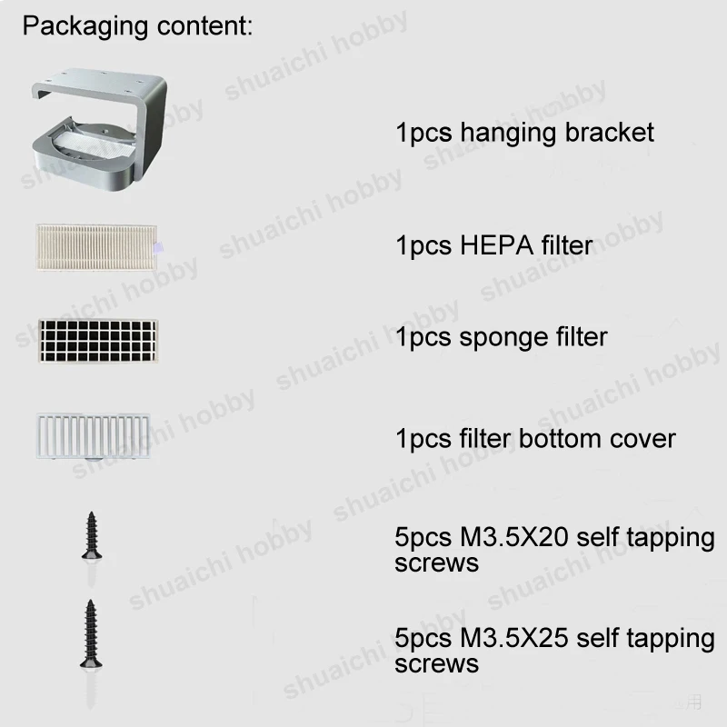 - Includes a HEPA filter, sponge filter, bottom cover, and self-tapping screws (M3.5×20 and M3.5×25) for straightforward assembly.