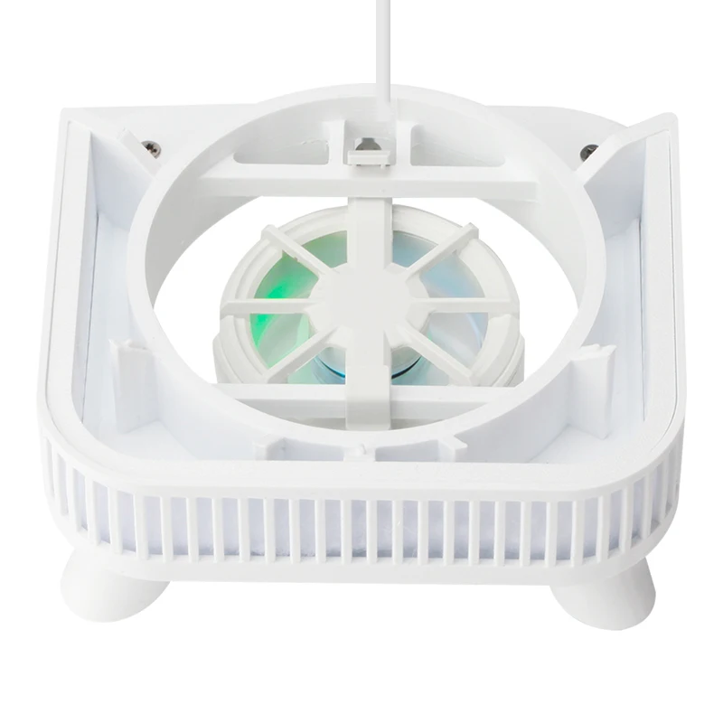 - Cooling fan with RGB lighting integrated within a black rectangular frame, designed to improve airflow and prevent device overheating during intensive use.