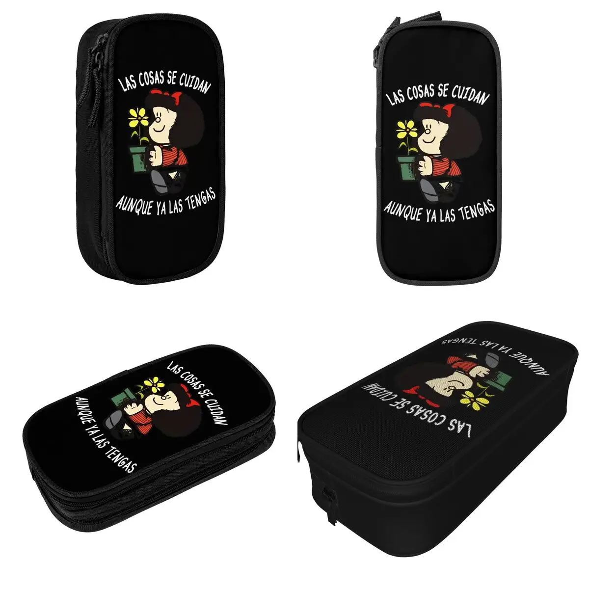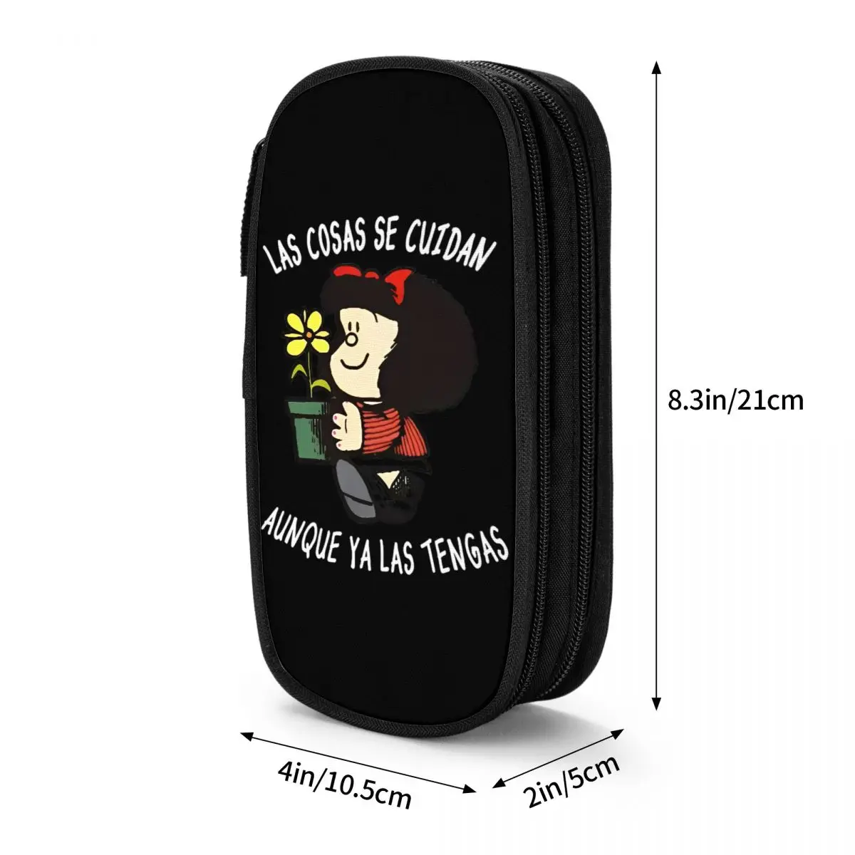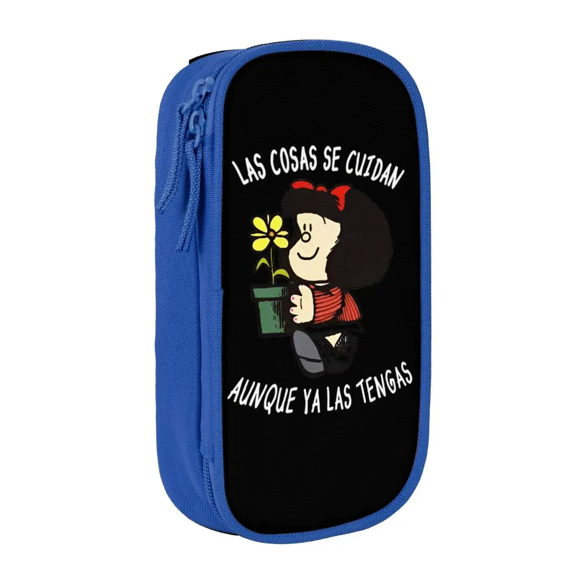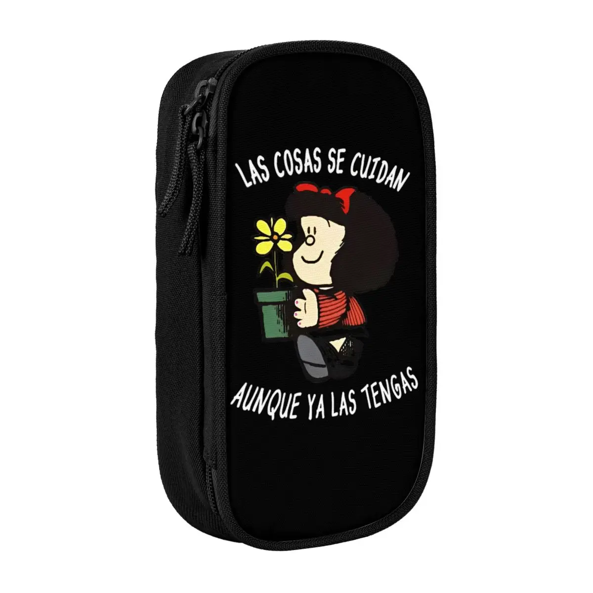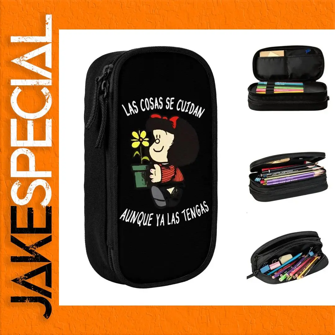 Introducing the Mafalda Mafie Cartoon Pencil Case, a stylish and whimsical storage solution perfect for school or office use. This cylindrical case, primarily black with a smooth leather-like texture, features a fun character graphic adorned with playful white phrases. Its large storage capacity is perfect for holding pens, pencils, and cosmetic supplies, while elastic bands inside securely organize your items. Available in black, blue, and pink colors, this novelty pencil case combines functionality with a youthful vibe, making it an ideal accessory for anyone looking to add a touch of character to their everyday essentials.