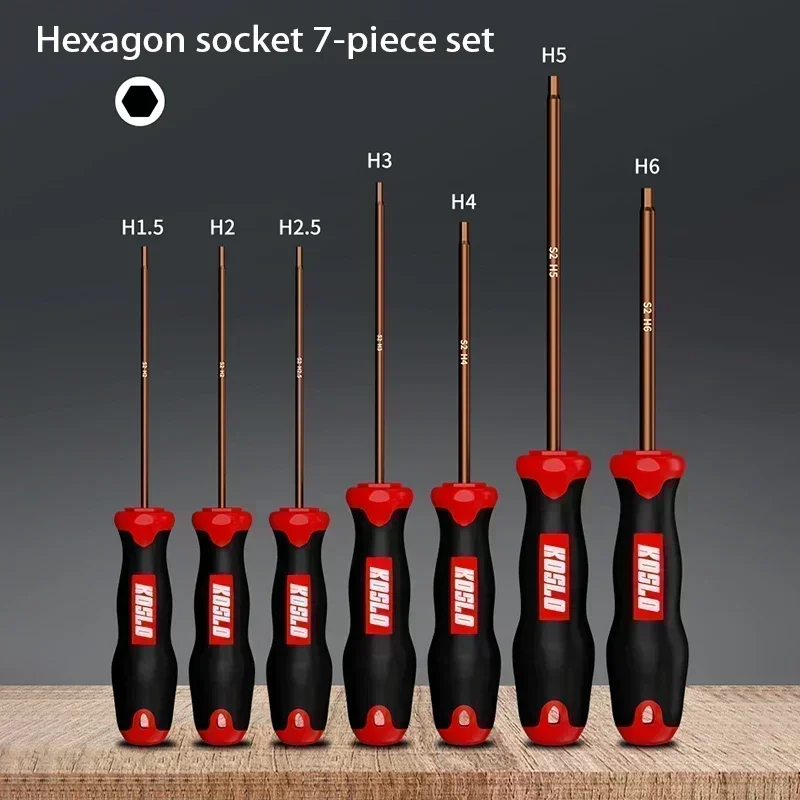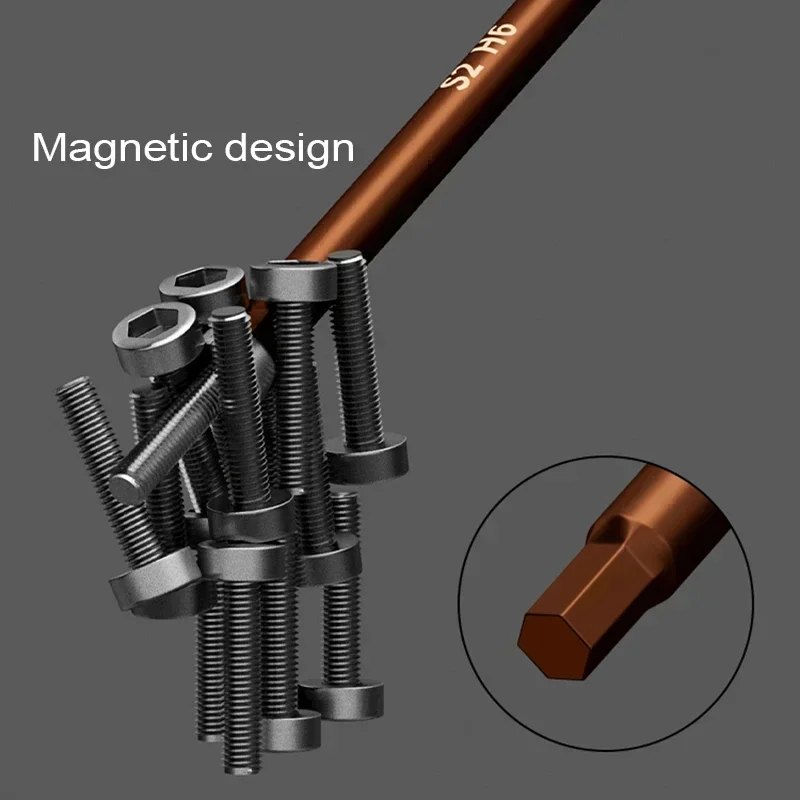 The Magnetic Allen Key Set features multifunctional hex keys made from durable alloy material, including model numbers H1.5, H2, H2.5, H3, H4, H5, and H6, organized in a convenient 7 PCS SET. Each wrench has an overall length of 185mm, rod thickness of 3mm, rod length of 100mm, shank length of 85mm, and a comfortable handle diameter of 25mm. Weighing only 30g, these tools are perfect for precise work, with polished hexagonal sockets for easy bolt retention, making them ideal for various applications, particularly in bicycle maintenance and assembly.