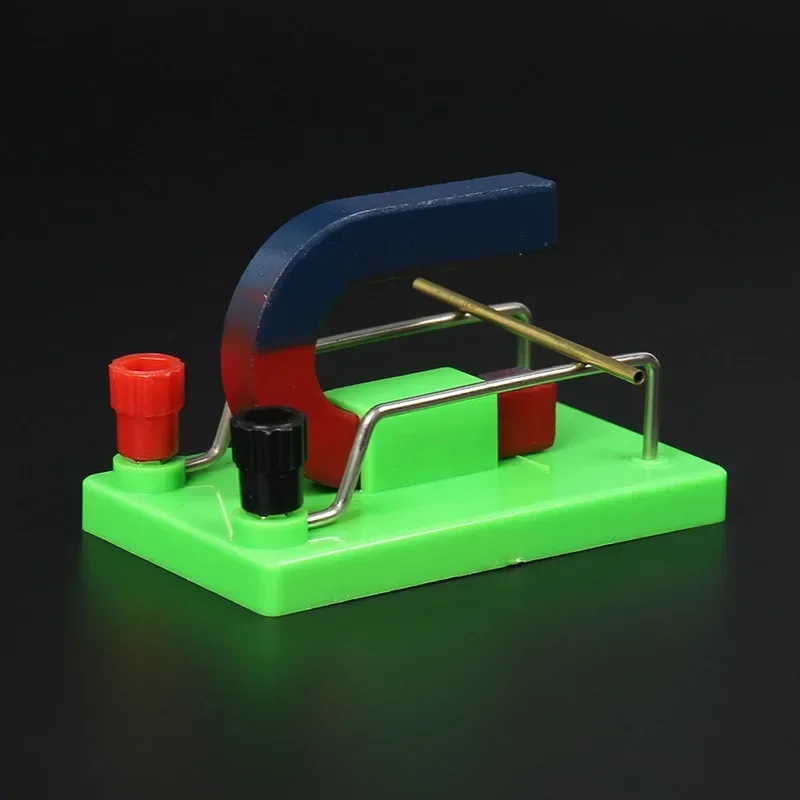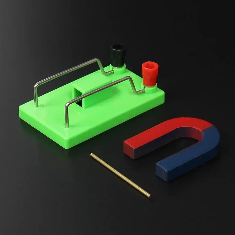 Experience engaging physics experiments with this colorful magnetic field apparatus designed for educational use. Featuring a bright lime green plastic base, it captures attention and fosters curiosity. The sleek, silver-colored metal conductors are arranged in parallel with a gentle curve, providing a clear view of current interaction. Prominently positioned is a large, bold red U-shaped magnetic component, emphasizing the magnetic field's role in the experiment. Two rotary knobs—one red and one black—are conveniently located, allowing easy adjustments to current flow or voltage, making setup straightforward. Crafted with minimalist design, this apparatus combines vivid colors and smooth surfaces to create an inviting, classroom-ready tool that simplifies complex physics concepts for junior students.