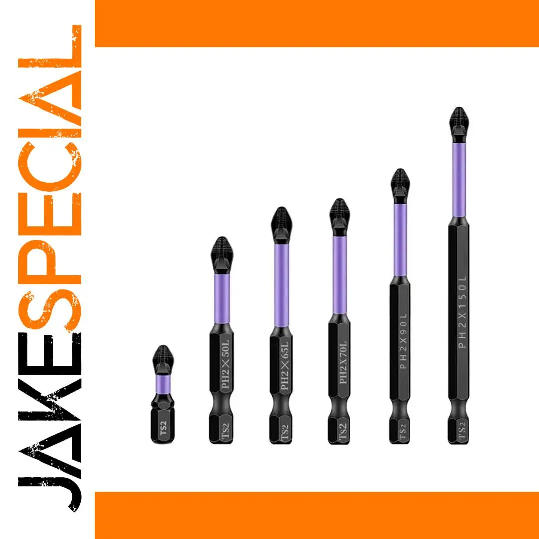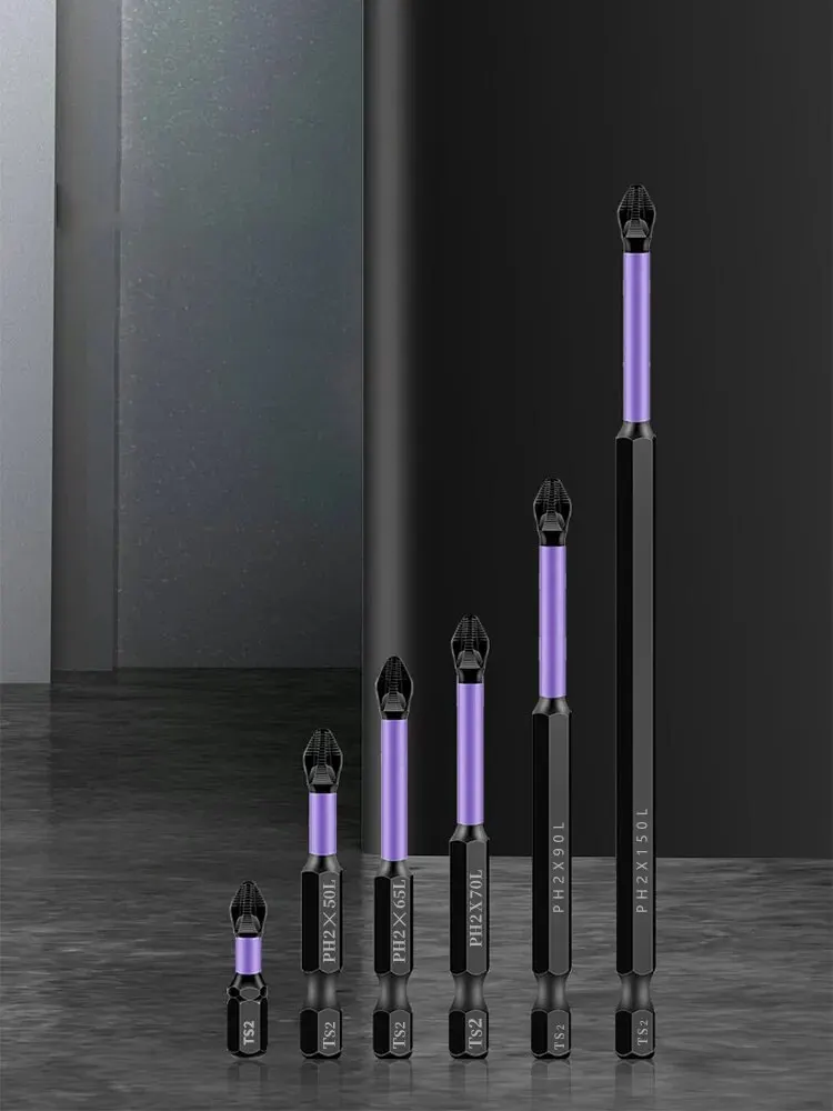 Imagine having a reliable set of impact bits that seamlessly combines durability, style, and precision for all your DIY or professional projects. This impact bits set features a sleek black design with a modern cylindrical shape, accented by a smooth purple section near the top, giving it a professional yet contemporary look. The bits are equipped with a magnetic, anti-shock design to ensure secure hold and durability during heavy-duty tasks. Each bit has a textured black surface near the tip for anti-slip grip and impact resistance, and clear white markings for quick identification. Sizes range from 25mm up to 150mm, making this set versatile enough for various screw sizes and applications. An essential addition to your toolkit for reliable performance.